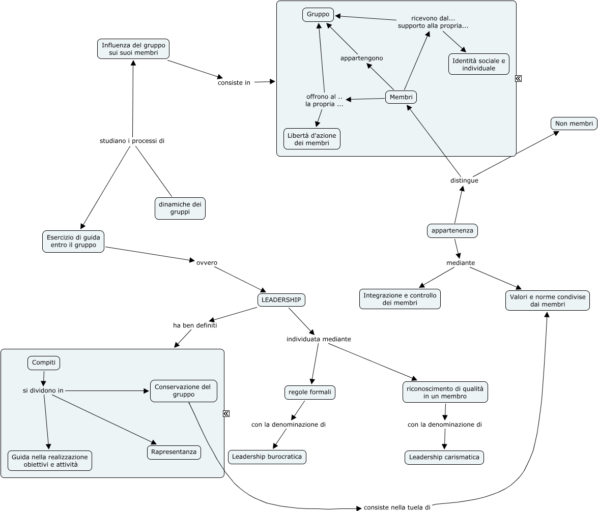 Dinamiche dei gruppi, riconoscimento di qualità in un membro con la denominazione di Leadership carismatica, Esercizio di guida entro il gruppo ovvero LEADERSHIP, Compiti si dividono in Rapresentanza, appartenenza distingue Membri, LEADERSHIP ha ben definiti COMPITI, appartenenza mediante Valori e norme condivise dai membri, Compiti si dividono in Guida nella realizzazione obiettivi e attività, appartenenza distingue Non membri, Membri ricevono dal... supporto alla propria... Identità sociale e individuale, Membri offrono al .. la propria ... Libertà d'azione dei membri
