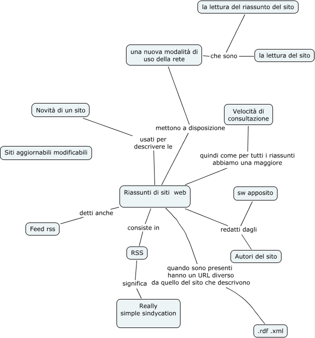 RSS, Autori del sito redatti dagli sw apposito, una nuova modalità di uso della rete che sono la lettura del sito, Riassunti di siti web quando sono presenti hanno un URL diverso da quello del sito che descrivono .rdf .xml, Riassunti di siti web quindi come per tutti i riassunti abbiamo una maggiore Velocità di consultazione, RSS consiste in Riassunti di siti web, una nuova modalità di uso della rete che sono la lettura del riassunto del sito, Autori del sito redatti dagli Riassunti di siti web, RSS significa Really simple sindycation, Riassunti di siti web detti anche Feed rss, Riassunti di siti web mettono a disposizione una nuova modalità di uso della rete