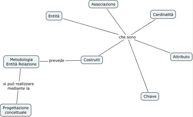 Metodologia E R, Progettazione concettuale si può realizzare mediante la Metodologia Entità Relazione, Costrutti che sono Entità, Metodologia Entità Relazione prevede Costrutti, Costrutti che sono Cardinalità, Costrutti che sono Chiave, Costrutti che sono Associazione, Costrutti che sono Attributo