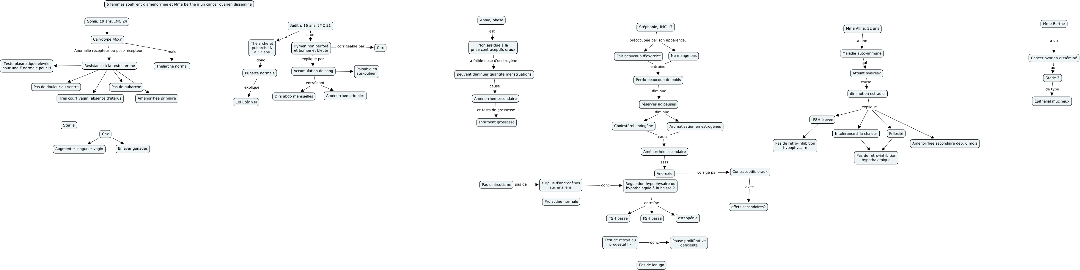 This Concept Map, created with IHMC CmapTools, has information related to: APP7 ALLER, Accumulation de sang Palpable en sus-pubien, Judith, 16 ans, IMC 21 a Thélarche et pubarche N à 12 ans, surplus d'androgènes surrénaliens donc Régulation hypophysaire ou hypothalaquie à la baisse ?, Accumulation de sang entraînant Dlrs abdo mensuelles, Non assidue à la prise contraceptifs oraux à faible dose d'oestrogène peuvent diminuer quantité menstruations, Résistance à la testostérone Pas de pubarche, diminution estradiol explique FSH élevée, Caryotype 46XY mais Thélarche normal, Régulation hypophysaire ou hypothalaquie à la baisse ? entraîne FSH basse, Cholestérol endogène cause Aménorrhée secondaire, Résistance à la testostérone Testo plasmatique élevée pour une F normale pour H, Cancer ovarien disséminé au Stade 3, Aménorrhée secondaire ???? Anorexie, Aménorrhée secondaire et tests de grossesse Infirment grossesse, Stéphanie, IMC 17 préoccupée par son apparence, Ne mange pas, Judith, 16 ans, IMC 21 a un Hymen non perforé et bombé et bleuté, Aromatisation en estrogènes cause Aménorrhée secondaire, Ne mange pas entraîne Perdu beaucoup de poids, Sonia, 19 ans, IMC 24 Caryotype 46XY, Hymen non perforé et bombé et bleuté corrigeable par Chx
