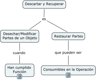 Este mapa conceptual tiene información relacionada a: Descartar y Recuperar, Descartar y Recuperar es Desechar/Modificar Partes de un Objeto, Desechar/Modificar Partes de un Objeto cuando Han cumplido Función, Restaurar Partes que pueden ser Consumibles en la Operación, Descartar y Recuperar es Restaurar Partes