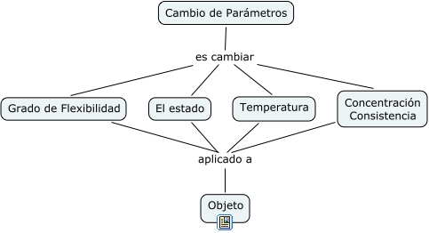 Este mapa conceptual tiene información relacionada a: cambio de parámetros, Cambio de Parámetros es cambiar Grado de Flexibilidad, Cambio de Parámetros es cambiar Temperatura, Concentración Consistencia aplicado a Objeto, Cambio de Parámetros es cambiar Concentración Consistencia, Cambio de Parámetros es cambiar El estado, Grado de Flexibilidad aplicado a Objeto, El estado aplicado a Objeto, Temperatura aplicado a Objeto