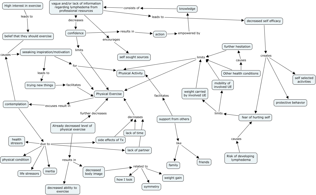 This Concept Map, created with IHMC CmapTools, has information related to: FG 3 combined, seeaking inspiration/motivation for Physical Exercise, contemplation due to lack of partner, Already decreased level of physical exercise results in decreased body image, decreased self efficacy creates protective behavior, further hesitation limits Physical Exercise, Already decreased level of physical exercise further decreases Physical Exercise, contemplation due to inertia, Already decreased level of physical exercise results in decreased ability to exercise, lack of time decreases Physical Exercise, seeaking inspiration/motivation leads to trying new things, Other health conditions causes further hesitation, contemplation due to physical condition, further hesitation limits Physical Activity, Physical Exercise excuses result in contemplation, contemplation due to life stressors, vague and/or lack of information regarding lymphedema from professional resources decreases confidence, fear of hurting self limits weight carried by involved UE, confidence results in action, decreased body image related to how I look, decreased self efficacy creates fear of hurting self