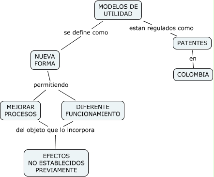 Este mapa conceptual tiene información relacionada a: MODELO DE UTILIDAD, DIFERENTE FUNCIONAMIENTO del objeto que lo incorpora EFECTOS NO ESTABLECIDOS PREVIAMENTE, PATENTES en COLOMBIA, NUEVA FORMA permitiendo MEJORAR PROCESOS, MODELOS DE UTILIDAD estan regulados como PATENTES, MODELOS DE UTILIDAD se define como NUEVA FORMA, MEJORAR PROCESOS del objeto que lo incorpora EFECTOS NO ESTABLECIDOS PREVIAMENTE, NUEVA FORMA permitiendo DIFERENTE FUNCIONAMIENTO