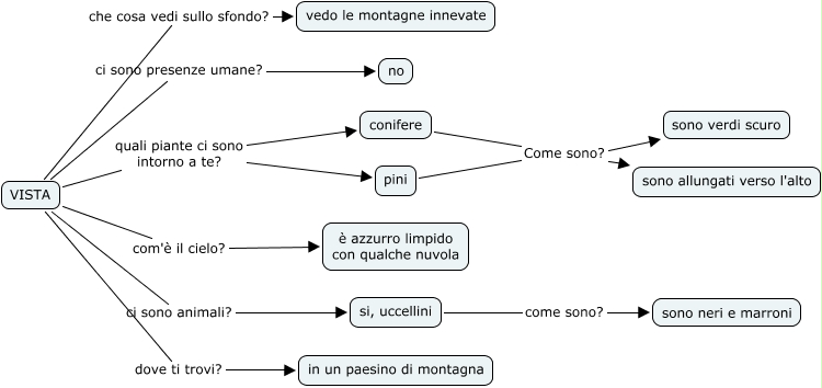 Questa Cmap, creata con IHMC CmapTools, contiene informazioni relative a: vista, VISTA ci sono animali? si, uccellini, VISTA dove ti trovi? in un paesino di montagna, conifere Come sono? sono allungati verso l'alto, si, uccellini come sono? sono neri e marroni, pini Come sono? sono verdi scuro, pini Come sono? sono allungati verso l'alto, VISTA ci sono presenze umane? no, VISTA quali piante ci sono intorno a te? pini, VISTA quali piante ci sono intorno a te? conifere, VISTA com'è il cielo? è azzurro limpido con qualche nuvola, VISTA che cosa vedi sullo sfondo? vedo le montagne innevate, conifere Come sono? sono verdi scuro