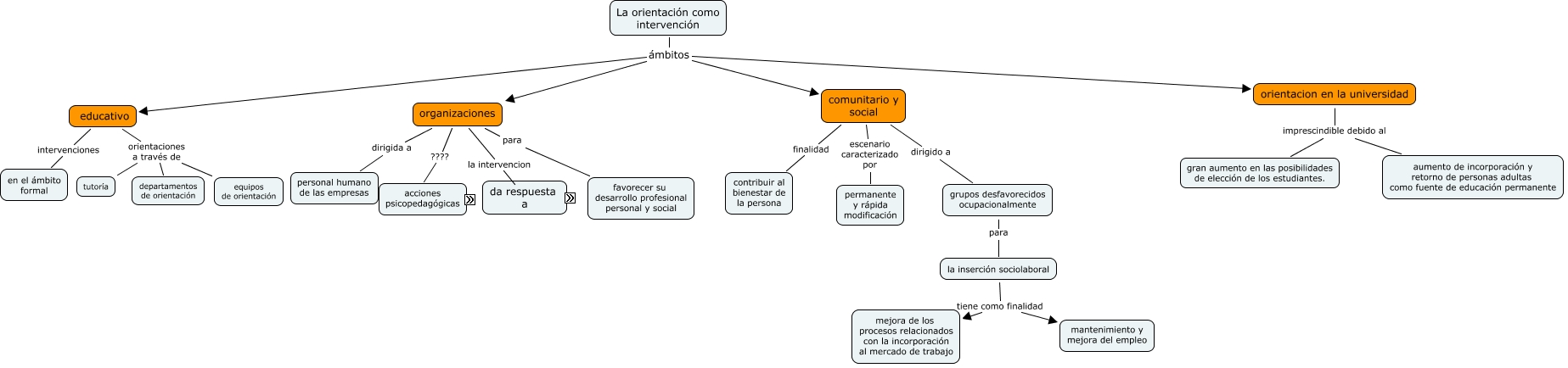 Este Cmap, tiene información relacionada con: 4 la orientación como intervención educativa, La orientación como intervención ámbitos educativo, organizaciones ???? acciones psicopedagógicas, la inserción sociolaboral tiene como finalidad mejora de los procesos relacionados con la incorporación al mercado de trabajo, orientacion en la universidad imprescindible debido al gran aumento en las posibilidades de elección de los estudiantes., La orientación como intervención ámbitos organizaciones, comunitario y social escenario caracterizado por permanente y rápida modificación, comunitario y social finalidad contribuir al bienestar de la persona, comunitario y social dirigido a grupos desfavorecidos ocupacionalmente, educativo intervenciones en el ámbito formal, educativo orientaciones a través de equipos de orientación, orientacion en la universidad imprescindible debido al aumento de incorporación y retorno de personas adultas como fuente de educación permanente, organizaciones la intervencion necesidad de mayor polivalencia autonomía y responsabilidad de los trabajadores, la inserción sociolaboral tiene como finalidad mantenimiento y mejora del empleo, educativo orientaciones a través de tutoría, educativo orientaciones a través de departamentos de orientación, grupos desfavorecidos ocupacionalmente para la inserción sociolaboral, La orientación como intervención ámbitos orientacion en la universidad, La orientación como intervención ámbitos comunitario y social, organizaciones dirigida a personal humano de las empresas, organizaciones para favorecer su desarrollo profesional personal y social