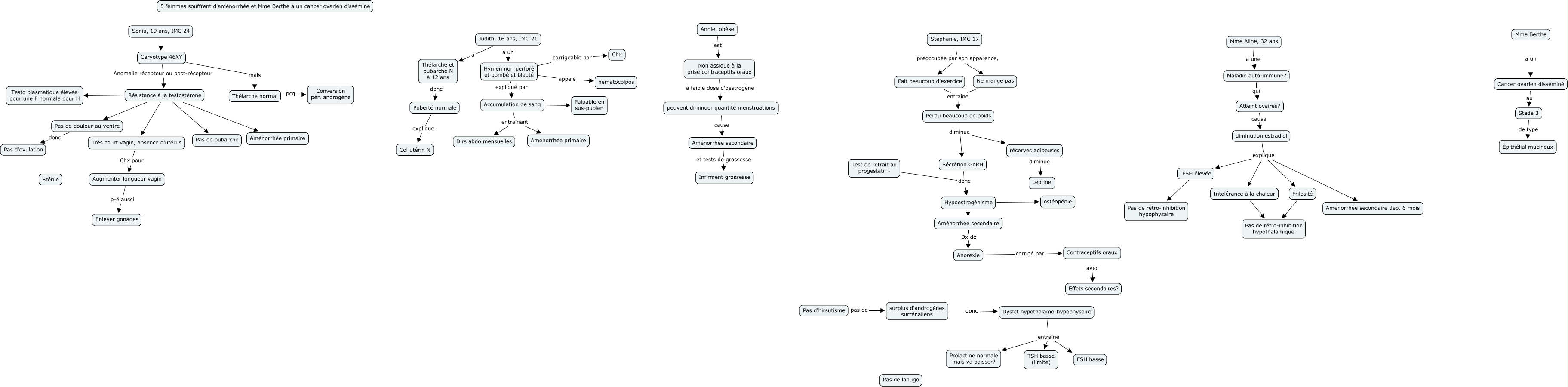 This Concept Map, created with IHMC CmapTools, has information related to: APP7 retour, Annie, obèse est Non assidue à la prise contraceptifs oraux, surplus d'androgènes surrénaliens donc Dysfct hypothalamo-hypophysaire, Hypoestrogénisme Aménorrhée secondaire, Puberté normale explique Col utérin N, Mme Aline, 32 ans a une Maladie auto-immune?, Cancer ovarien disséminé au Stade 3, Stade 3 de type Épithélial mucineux, Résistance à la testostérone Aménorrhée primaire, Très court vagin, absence d'utérus Chx pour Augmenter longueur vagin, Ne mange pas entraîne Perdu beaucoup de poids, diminution estradiol explique Intolérance à la chaleur, Judith, 16 ans, IMC 21 a un Hymen non perforé et bombé et bleuté, diminution estradiol explique FSH élevée, Accumulation de sang Palpable en sus-pubien, Hypoestrogénisme ostéopénie, Mme Berthe a un Cancer ovarien disséminé, Fait beaucoup d'exercice entraîne Perdu beaucoup de poids, Non assidue à la prise contraceptifs oraux à faible dose d'oestrogène peuvent diminuer quantité menstruations, Pas d'hirsutisme pas de surplus d'androgènes surrénaliens, peuvent diminuer quantité menstruations cause Aménorrhée secondaire