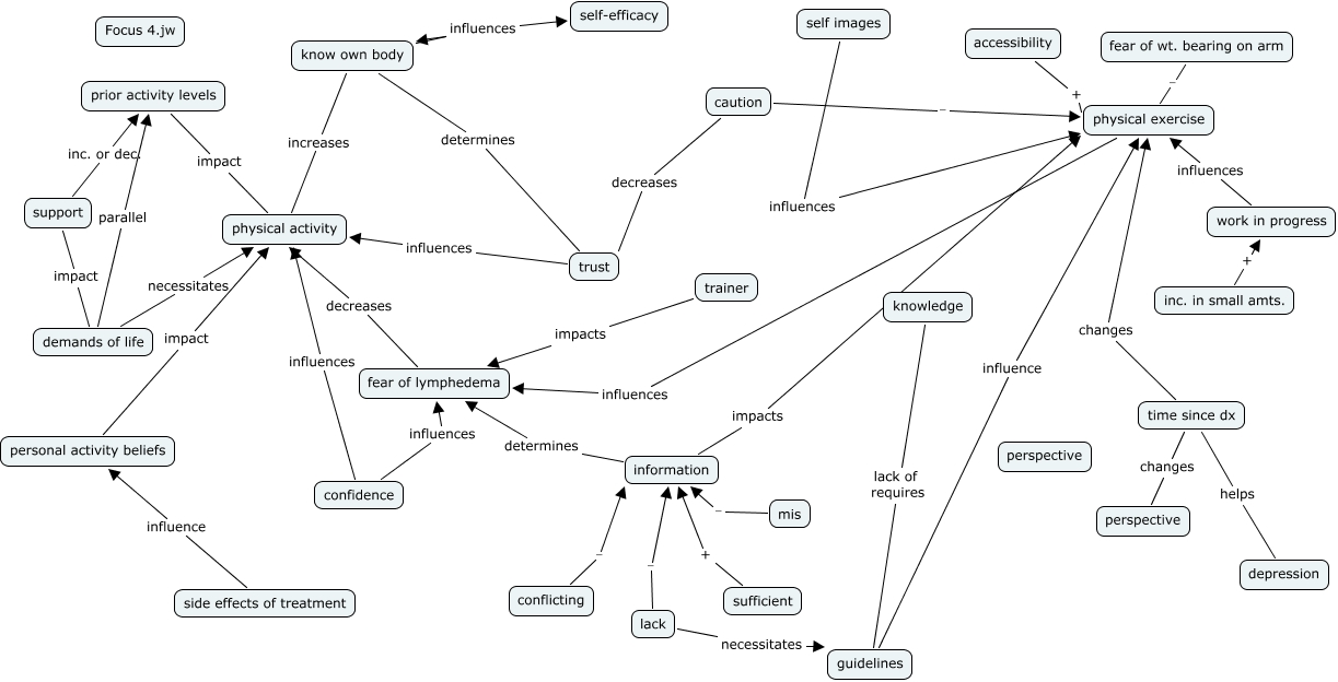 This Concept Map, created with IHMC CmapTools, has information related to: focus group 4.jw, prior activity levels impact physical activity, side effects of treatment influence personal activity beliefs, fear of wt. bearing on arm - physical exercise, mis - information, accessibility + physical exercise, conflicting - information, trust influences physical activity, information determines fear of lymphedema, physical exercise influences fear of lymphedema, know own body determines trust, demands of life parallel prior activity levels, time since dx changes physical exercise, lack - information, know own body influences self-efficacy, trainer impacts fear of lymphedema, caution - physical exercise, know own body increases physical activity, support impact demands of life, confidence influences fear of lymphedema, inc. in small amts. + work in progress