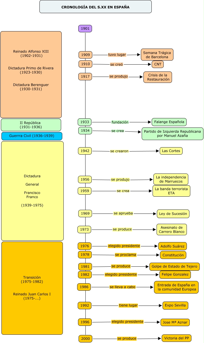 25.Jorge Valdés Guerrero-eje cronologico, 1973 se produce Asesinato de Carrero Blanco, 2000 se produce Victoria del PP, 1982 elegido presidente Felipe Gonzalez, 1992 tiene lugar Expo Sevilla, 1934 se crea Partido de Izquierda Republicana por Manuel Azaña, 1909 tuvo lugar Semana Trágica de Barcelona, 1933 fundación Falange Española, 1910 se creó CNT, 1981 se produce Golpe de Estado de Tejero, 1996 elegido presidente Jose Mª Aznar