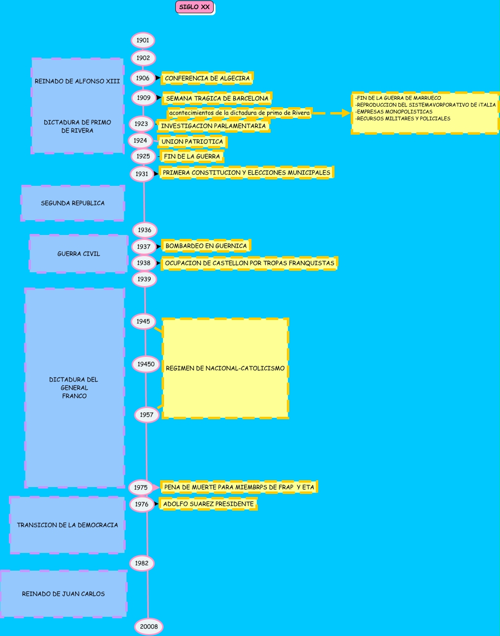 Este mapa conceptual tiene información relacionada a: 02.marina aragon de lema.siglo xx, 1909 SEMANA TRAGICA DE BARCELONA, 1901 20008, 1938 OCUPACION DE CASTELLON POR TROPAS FRANQUISTAS, 1906 CONFERENCIA DE ALGECIRA, 1945 ???? REGIMEN DE NACIONAL-CATOLICISMO, 1976 ADOLFO SUAREZ PRESIDENTE, 1957 ???? REGIMEN DE NACIONAL-CATOLICISMO, 1975 PENA DE MUERTE PARA MIEMBRPS DE FRAP Y ETA, 1931 PRIMERA CONSTITUCION Y ELECCIONES MUNICIPALES, 1937 BOMBARDEO EN GUERNICA