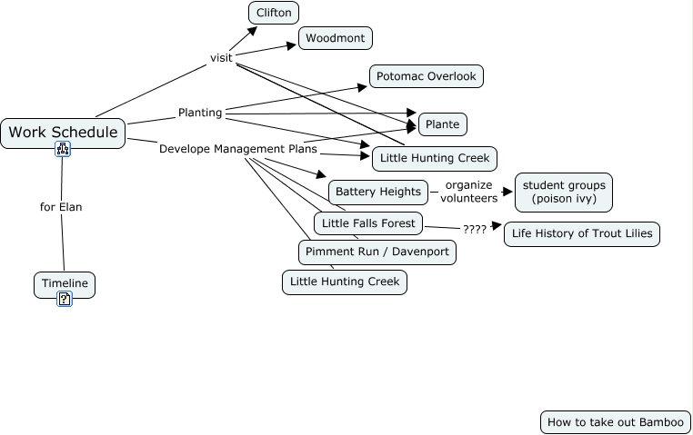 This Concept Map, created with IHMC CmapTools, has information related to: Work Schedule, Work Schedule Develope Management Plans Battery Heights, Work Schedule Develope Management Plans Little Hunting Creek, Work Schedule Develope Management Plans Little Hunting Creek, Work Schedule Planting Little Hunting Creek, Work Schedule Planting Potomac Overlook, Work Schedule Develope Management Plans Little Falls Forest, Battery Heights organize volunteers student groups (poison ivy), Work Schedule Planting Plante, Work Schedule visit Plante, Work Schedule visit Clifton, Work Schedule for Elan Timeline, Little Falls Forest ???? Life History of Trout Lilies, Work Schedule visit Little Hunting Creek, Work Schedule Develope Management Plans Plante, Work Schedule visit Woodmont, Work Schedule Develope Management Plans Pimment Run / Davenport, Work Schedule visit Little Hunting Creek