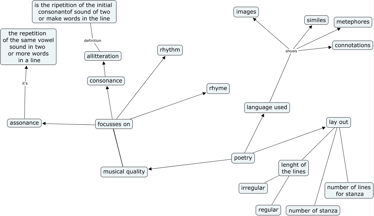 Questa Mappa Concettuale ha informazioni correlate a: Monteleone provvisorio poetry, lenght of the lines ???? regular, musical quality ???? rhyme, focusses on ???? consonance, language used shows connotations, lay out ???? number of stanza, musical quality focussed on assonance, language used shows similes, lay out ???? lenght of the lines, lay out ???? number of lines for stanza, poetry ???? language used, lenght of the lines ???? irregular, musical quality ???? rhythm, language used shows metephores, consonance ???? allitteration, allitteration definition ????, musical quality focussed on focusses on, poetry ???? musical quality, assonance it's the repetition of the same vowel sound in two or more words in a line, poetry ???? lay out, language used shows images