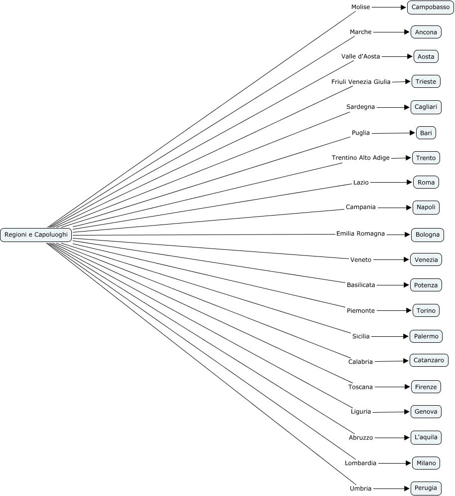 Questa Cmap, creata con IHMC CmapTools, contiene informazioni relative a: regioni e capoluoghi, Regioni e Capoluoghi Sicilia Palermo, Regioni e Capoluoghi Emilia Romagna Bologna, Regioni e Capoluoghi Friuli Venezia Giulia Trieste, Regioni e Capoluoghi Umbria Perugia, Regioni e Capoluoghi Valle d'Aosta Aosta, Regioni e Capoluoghi Marche Ancona, Regioni e Capoluoghi Trentino Alto Adige Trento, Regioni e Capoluoghi Molise Campobasso, Regioni e Capoluoghi Piemonte Torino, Regioni e Capoluoghi Lombardia Milano, Regioni e Capoluoghi Basilicata Potenza, Regioni e Capoluoghi Campania Napoli, Regioni e Capoluoghi Veneto Venezia, Regioni e Capoluoghi Calabria Catanzaro, Regioni e Capoluoghi Lazio Roma, Regioni e Capoluoghi Sardegna Cagliari, Regioni e Capoluoghi Liguria Genova, Regioni e Capoluoghi Toscana Firenze, Regioni e Capoluoghi Puglia Bari, Regioni e Capoluoghi Abruzzo L'aquila