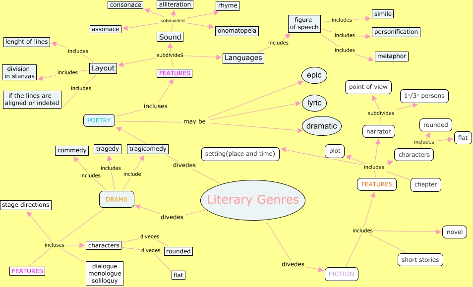 Questa Mappa Concettuale ha informazioni correlate a: e_tutor2008 Literary Genres, Sound subdivided assonace, FICTION includes novel, characters includes rounded, FEATURES subdivides Languages, DRAMA include tragicomedy, FEATURES includes setting(place and time), FICTION includes FEATURES, characters divedes rounded, Literary Genres divedes POETRY, POETRY may be lyric, FEATURES subdivides Sound, figure of speech includes simile, Layout includes if the lines are aligned or indeted, Literary Genres divedes FICTION, POETRY may be epic, DRAMA includes commedy, FICTION includes short stories, characters divedes flat, Sound subdivided consonace, FEATURES includes chapter