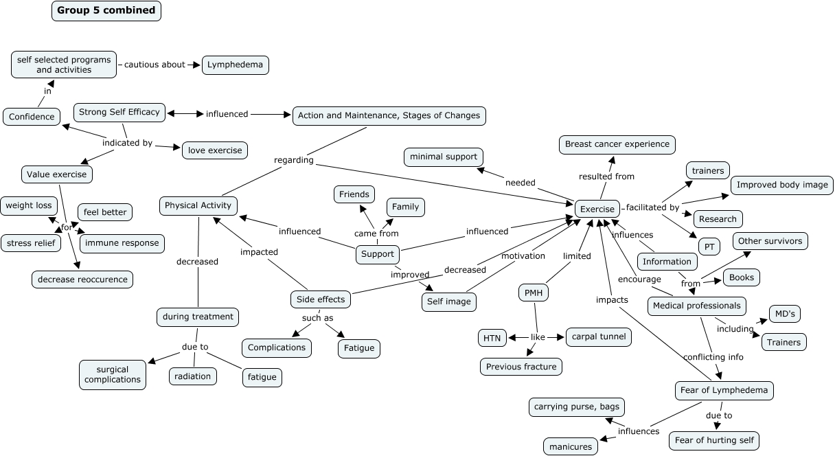 This Concept Map, created with IHMC CmapTools, has information related to: fg 5 combined, Physical Activity decreased during treatment, Side effects such as Complications, Strong Self Efficacy indicated by Value exercise, Exercise facilitated by trainers, Side effects such as Fatigue, Value exercise for immune response, during treatment due to fatigue, during treatment due to radiation, Information from Books, Support came from Family, Exercise facilitated by Research, Medical professionals encourage Exercise, Fear of Lymphedema impacts Exercise, Value exercise for stress relief, Action and Maintenance, Stages of Changes regarding Physical Activity, Strong Self Efficacy indicated by Confidence, Fear of Lymphedema influences manicures, Support improved Self image, Medical professionals conflicting info Fear of Lymphedema, Action and Maintenance, Stages of Changes regarding Exercise