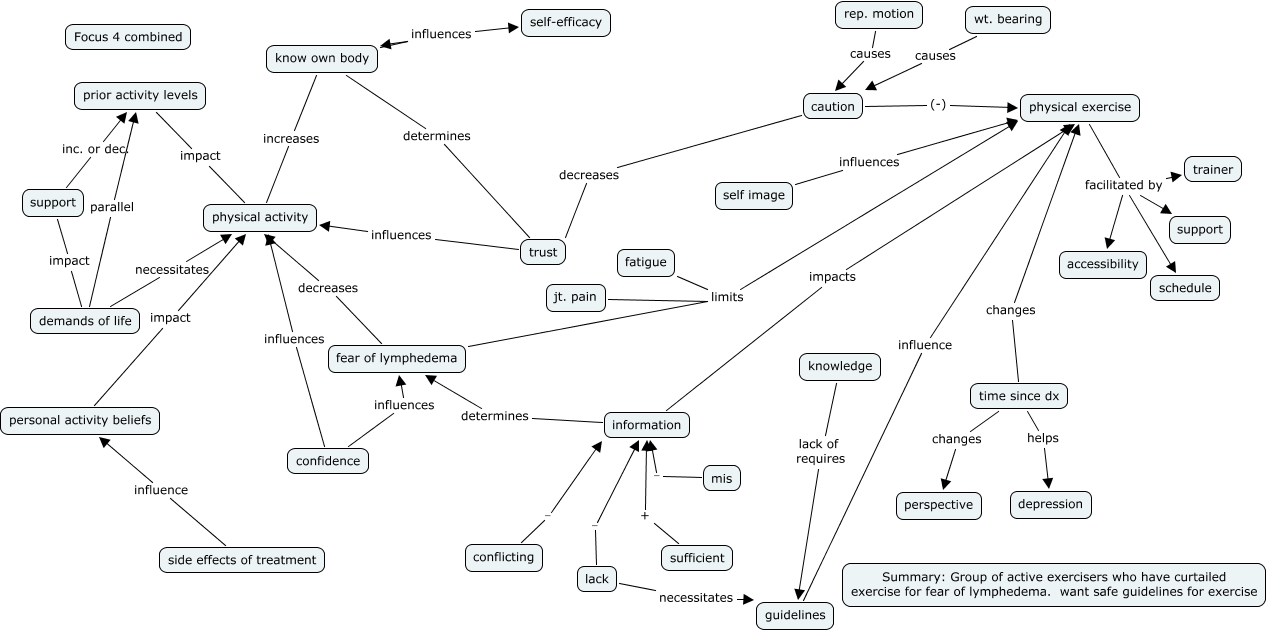 This Concept Map, created with IHMC CmapTools, has information related to: focus group 4 combined, prior activity levels impact physical activity, side effects of treatment influence personal activity beliefs, physical exercise facilitated by accessibility, mis - information, trust influences physical activity, conflicting - information, information determines fear of lymphedema, physical exercise facilitated by trainer, know own body determines trust, physical exercise facilitated by schedule, demands of life parallel prior activity levels, jt. pain limits physical exercise, self image influences physical exercise, rep. motion causes caution, know own body influences self-efficacy, lack - information, guidelines influence physical exercise, know own body increases physical activity, confidence influences fear of lymphedema, support impact demands of life