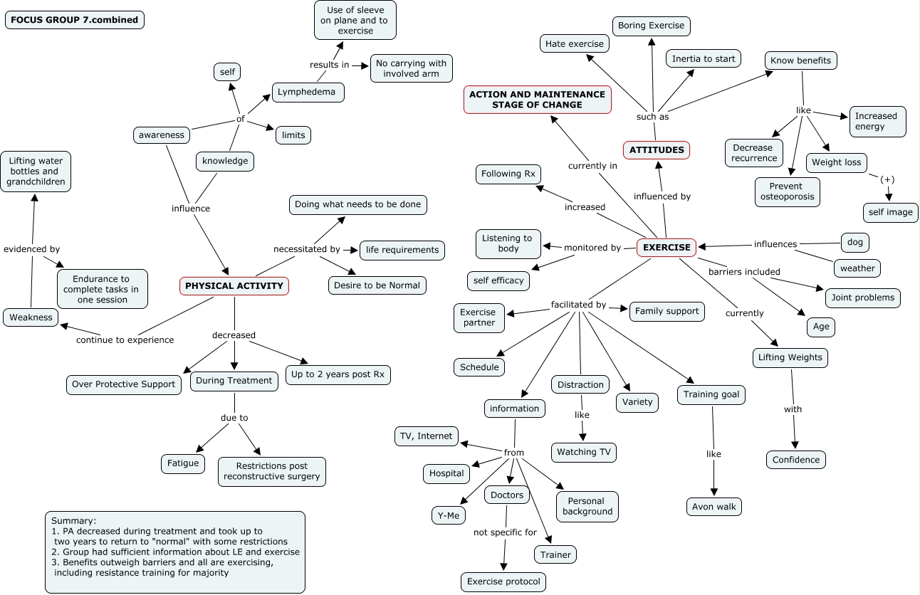This Concept Map, created with IHMC CmapTools, has information related to: Focus Group 7 combined, ATTITUDES such as Know benefits, PHYSICAL ACTIVITY necessitated by life requirements, EXERCISE currently Lifting Weights, EXERCISE barriers included Joint problems, Lymphedema results in No carrying with involved arm, EXERCISE increased Following Rx, knowledge influence PHYSICAL ACTIVITY, ATTITUDES such as Inertia to start, EXERCISE monitored by Listening to body, information from Doctors, EXERCISE facilitated by Family support, EXERCISE barriers included Age, EXERCISE facilitated by information, awareness of limits, EXERCISE influenced by ATTITUDES, EXERCISE facilitated by Variety, information from TV, Internet, Weakness evidenced by Lifting water bottles and grandchildren, information from Trainer, ATTITUDES such as Hate exercise