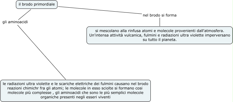 Questa Cmap, creata con IHMC CmapTools, contiene informazioni relative a: il brodo primordiale, il brodo primordiale gli aminoacidi le radiazioni ultra violette e le scariche elettriche dei fulmini causano nel brodo reazioni chimichr fra gli atomi; le molecole in esso sciolte si formano cosi molecole più complesse , gli aminoacidi che sono le più semplici molecole organiche presenti negli esseri viventi, il brodo primordiale nel brodo si forma si mescolano alla rinfusa atomi e molecole provenienti dall'atmosfera. Un'intensa attività vulcanica, fulmini e radiazioni ultra violette imperversano su tutto il pianeta.