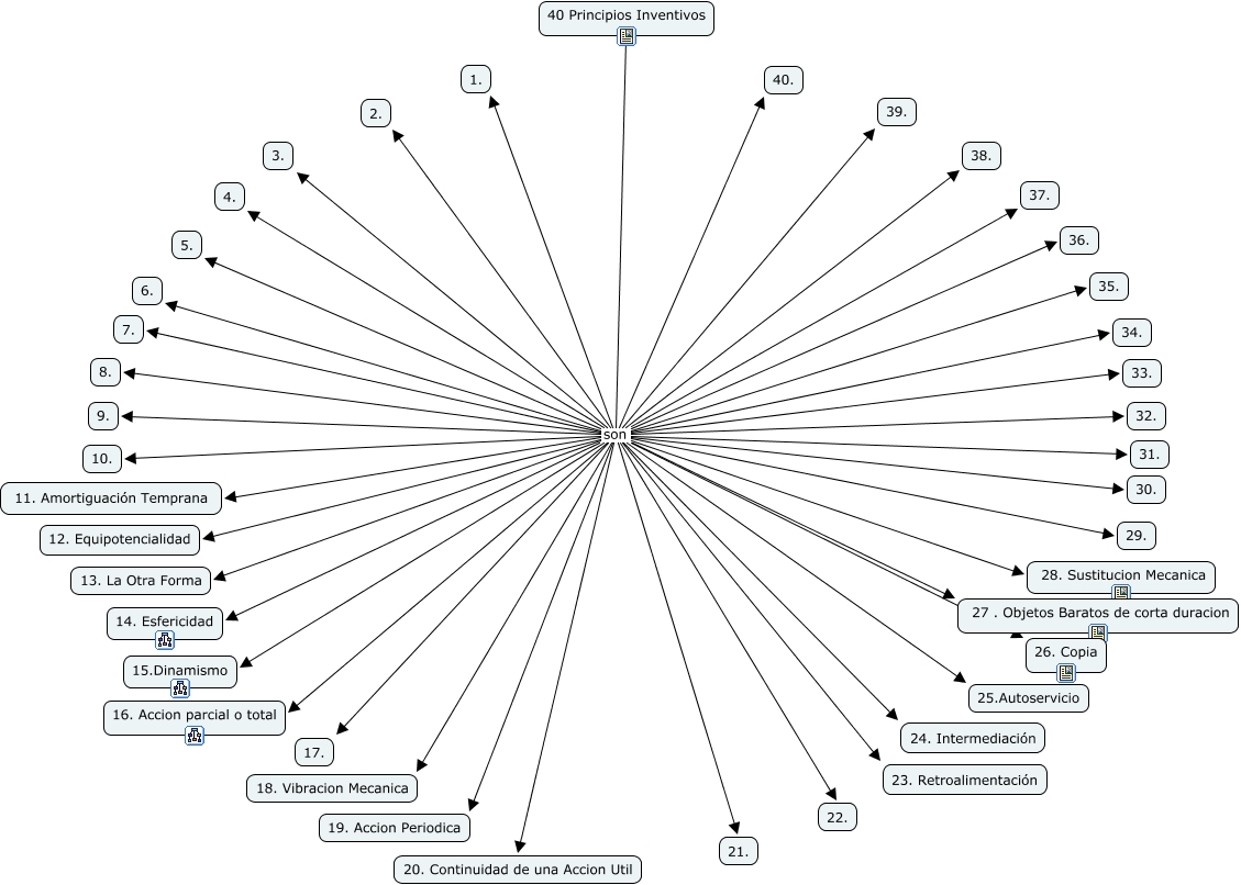 Este Cmap, tiene información relacionada con: 40 Principios Inventivos, 40 Principios Inventivos son 29., 40 Principios Inventivos son 19. Accion Periodica, 40 Principios Inventivos son 12. Equipotencialidad, 40 Principios Inventivos son 26. Copia, 40 Principios Inventivos son 10., 40 Principios Inventivos son 18. Vibracion Mecanica, 40 Principios Inventivos son 33., 40 Principios Inventivos son 7., 40 Principios Inventivos son 22., 40 Principios Inventivos son 15.Dinamismo, 40 Principios Inventivos son 21., 40 Principios Inventivos son 6., 40 Principios Inventivos son 25.Autoservicio, 40 Principios Inventivos son 36., 40 Principios Inventivos son 35., 40 Principios Inventivos son 11. Amortiguación Temprana, 40 Principios Inventivos son 30., 40 Principios Inventivos son 40., 40 Principios Inventivos son 27 . Objetos Baratos de corta duracion, 40 Principios Inventivos son 17.