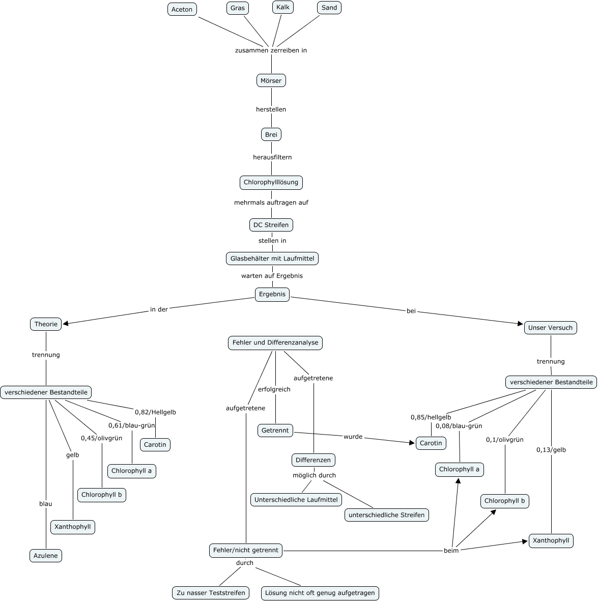 This Concept Map, created with IHMC CmapTools, has information related to: Chlorophyll und Chromatographie, Fehler und Differenzanalyse erfolgreich Getrennt, Ergebnis bei Unser Versuch, Getrennt wurde Carotin, Fehler/nicht getrennt beim Chlorophyll a, Fehler und Differenzanalyse aufgetretene Differenzen, Theorie trennung verschiedener Bestandteile, Unser Versuch trennung verschiedener Bestandteile, verschiedener Bestandteile 0,45/olivgrün Chlorophyll b, Glasbehälter mit Laufmittel warten auf Ergebnis Ergebnis, verschiedener Bestandteile 0,1/olivgrün Chlorophyll b, DC Streifen stellen in Glasbehälter mit Laufmittel, Fehler/nicht getrennt durch Lösung nicht oft genug aufgetragen, verschiedener Bestandteile 0,13/gelb Xanthophyll, Differenzen möglich durch unterschiedliche Streifen, Mörser herstellen Brei, verschiedener Bestandteile 0,82/Hellgelb Carotin, Brei herausfiltern Chlorophylllösung, Chlorophylllösung mehrmals auftragen auf DC Streifen, verschiedener Bestandteile 0,61/blau-grün Chlorophyll a, verschiedener Bestandteile blau Azulene