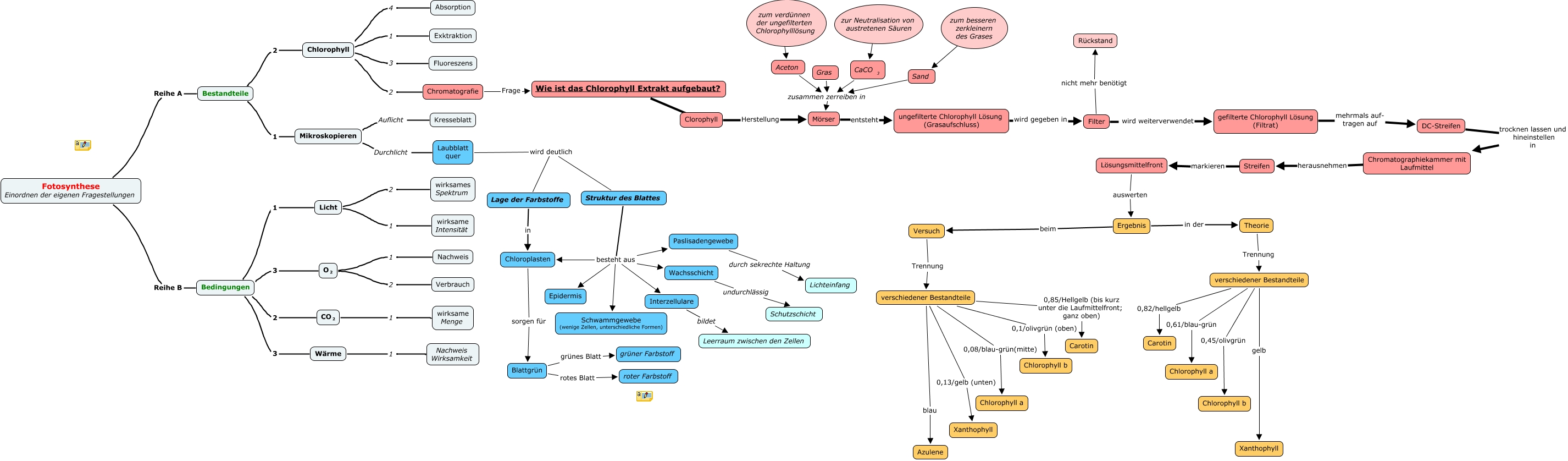 This Concept Map, created with IHMC CmapTools, has information related to: fotosynthese, zusammenfassung aller C-maps (von kerstin), Mikroskopieren Durchlicht Laubblatt quer, Theorie Trennung verschiedener Bestandteile, Bedingungen 3 <math xmlns="http://www.w3.org/1998/Math/MathML"> <mrow> <mmultiscripts> <mtext> O </mtext> <mtext> 2 </mtext> <none/> </mmultiscripts> </mrow> </math>, zum verdünnen der ungefilterten Chlorophylllösung ???? Aceton, Struktur des Blattes besteht aus Paslisadengewebe, Bestandteile 2 Chlorophyll, Blattgrün rotes Blatt roter Farbstoff, verschiedener Bestandteile 0,85/Hellgelb (bis kurz unter die Laufmittelfront; ganz oben) Carotin, Chlorophyll 2 Chromatografie, Streifen markieren Lösungsmittelfront, Mikroskopieren Auflicht Kresseblatt, Filter wird weiterverwendet gefilterte Chlorophyll Lösung (Filtrat), Aceton zusammen zerreiben in Mörser, zur Neutralisation von austretenen Säuren ???? <math xmlns="http://www.w3.org/1998/Math/MathML"> <mrow> <mtext> CaCO </mtext> <mmultiscripts> <mtext> </mtext> <mtext> 3 </mtext> <none/> </mmultiscripts> </mrow> </math>, Mörser entsteht ungefilterte Chlorophyll Lösung (Grasaufschluss), Chlorophyll 1 Exktraktion, Filter nicht mehr benötigt Rückstand, Bedingungen 3 Wärme, zum besseren zerkleinern des Grases ???? Sand, Fotosynthese Einordnen der eigenen Fragestellungen Reihe B Bedingungen