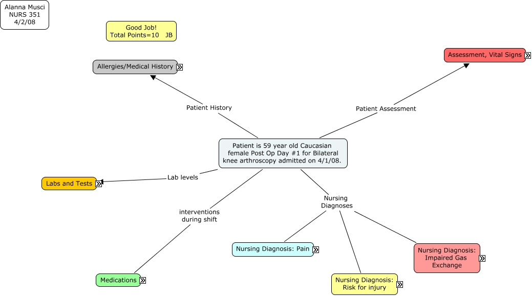 This Concept Map, created with IHMC CmapTools, has information related to: Acute Care 4.02.08, Risk for injury related to altered physical mobility, low H & H levels interventions Apply venous compression stockings to lower exremities bilaterally. Remove 30 minutes per shift and assess before reapplying., Assessment G/U Foley catheter urine yellow,clear Output: *i did not write it down, Assess patient lower extremities for warmth redness, tenderness/soreness outcome Patient has no signs of DVT formation, Integumentary assessment within normal limits: no warmth, redness or tenderness. Patient extremities pale., Reassess pain level atleast 3 times during shift and record PCA pump use: being mindful of number of doses and number of attempts outcome Checked pain level through out shift. Patient pain decreased to a 0/10 after reassessment, Assessment Neuro/muscular Alert and Oriented x3 Muscle Strength: 5 BUE, 4 BLE, able to flex foot In bed, PT in AM CPM machine 30 degrees BIL, Patient will verbalize decrease in pain to acceptable level below 2/10. interventions Reassess pain level atleast 3 times during shift and record PCA pump use: being mindful of number of doses and number of attempts, Assessment Vital Signs Vitals q2h 1500 Temp:37.1C Pulse: 80 Resp: 18 B/P: 109/65 O2: 99% RA Pain: 0/10, Warfarin Tab 2.5mg PO 4/2/08 only (2100) used for Prevent clotting, prevent DVT formation from knee arthroscopy and decreased mobility, Risk for injury related to altered physical mobility, low H & H levels interventions Patient will change positions every 2 hours to promote range of motion and decrease risk of DVT. Use CPM machine to enhance ROM bilaterally., Impaired Gas Exchange related to decreased hemoglobin & hematocrit, being immobile post surgery, as evidenced by abnormal labs, pale skin, fatigue interventions Elevate Head of Bed to help chest expansion. Encourage incentive spirometry to increase lung expansion and decrease occurance of atelectasis, Assessment Respiratory Lung sounds: Clear in all fields No use of accessory muscles Symmetrical chest expansion, Risk for injury related to altered physical mobility, low H & H levels interventions Assess patient lower extremities for warmth redness, tenderness/soreness, Impaired Gas Exchange related to decreased hemoglobin & hematocrit, being immobile post surgery, as evidenced by abnormal labs, pale skin, fatigue interventions Check Sa02 q shift. If decreased, notify nurse and monitor until return to acceptable level, Assess patient lung sounds for abnormal/diminished sounds Assess for cough or sputum outcome Patient had clear lung sounds in Left/Right ant/post lung fields No noticable SOB. No cough., Assessment Skin/drains Skin is warm, pale, no breakdown Hemovac R and L knee Serosanguinous fluid Dressing D & I, Assess patient for SOB, increased HR or BP outcome Patient did not appear to be SOB No complaints of dyspnea while at rest. Patient was fatigued. HR and BP within normal limits, Encourage use of PCA pump. Reminding the patient to push the button when she is in pain, and the pump will not overdose her. outcome Patient resting, reported pain as 0/10, Patient is 59 year old Caucasian female Post Op Day #1 for Bilateral knee arthroscopy admitted on 4/1/08. Nursing Diagnoses Nursing Diagnosis: Pain, Check Sa02 q shift. If decreased, notify nurse and monitor until return to acceptable level outcome Patient SaO2 at 98% and maintained throughout shift, Assessment Cardiac Apical Pulse regular Radial pulse +2 Bil Femoral pulse +2 Bil Dorsalis Pedis +2 Bil Post Tibia +2 Bil Cap refill brisk Warm temperature no numbness or tingling 2 units blood 1300 and 2000