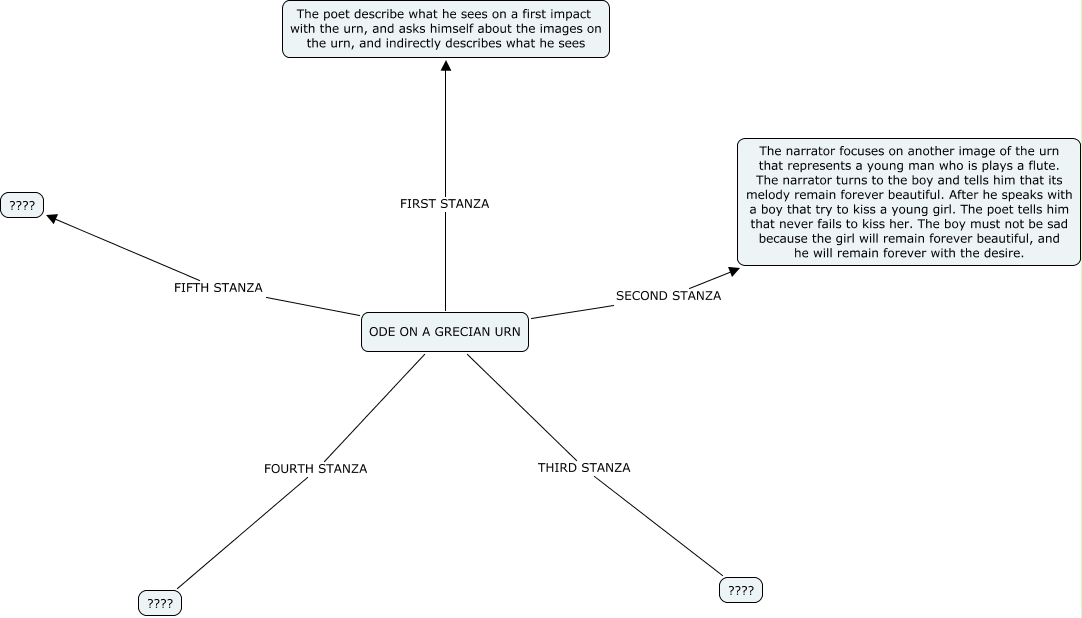 Questa Mappa Concettuale ha informazioni correlate a: Senza titolo 2, ODE ON A GRECIAN URN FIFTH STANZA ????, ODE ON A GRECIAN URN THIRD STANZA ????, ODE ON A GRECIAN URN FIRST STANZA The poet describe what he sees on a first impact with the urn, and asks himself about the images on the urn, and indirectly describes what he sees, ODE ON A GRECIAN URN SECOND STANZA The narrator focuses on another image of the urn that represents a young man who is plays a flute. The narrator turns to the boy and tells him that its melody remain forever beautiful. After he speaks with a boy that try to kiss a young girl. The poet tells him that never fails to kiss her. The boy must not be sad because the girl will remain forever beautiful, and he will remain forever with the desire., ODE ON A GRECIAN URN FOURTH STANZA ????
