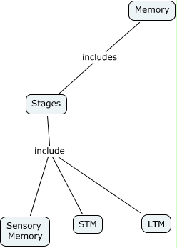 This Concept Map, created with IHMC CmapTools, has information related to: CH 8 courtney gibbs, Stages include STM, Stages include Sensory Memory, Stages include LTM, Memory includes Stages
