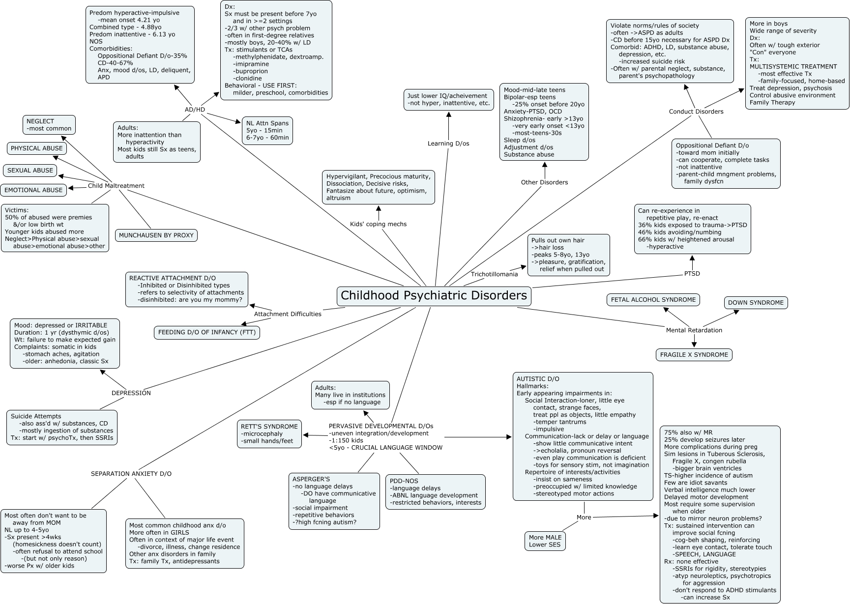 This Concept Map, created with IHMC CmapTools, has information related to: Childhood Disorders, Childhood Psychiatric Disorders Conduct Disorders More in boys Wide range of severity Dx: Often w/ tough exterior "Con" everyone Tx: MULTISYSTEMIC TREATMENT -most effective Tx -family-focused, home-based Treat depression, psychosis Control abusive environment Family Therapy, Childhood Psychiatric Disorders Child Maltreatment Victims: 50% of abused were premies &/or low birth wt Younger kids abused more Neglect>Physical abuse>sexual abuse>emotional abuse>other, Childhood Psychiatric Disorders PERVASIVE DEVELOPMENTAL D/Os -uneven integration/development -1:150 kids ɝyo - CRUCIAL LANGUAGE WINDOW AUTISTIC D/O Hallmarks: Early appearing impairments in: Social Interaction-loner, little eye contact, strange faces, treat ppl as objects, little empathy -temper tantrums -impulsive Communication-lack or delay or language -show little communicative intent ->echolalia, pronoun reversal -even play communication is deficient -toys for sensory stim, not imagination Repertoire of interests/activities -insist on sameness -preoccupied w/ limited knowledge -stereotyped motor actions, Childhood Psychiatric Disorders PERVASIVE DEVELOPMENTAL D/Os -uneven integration/development -1:150 kids ɝyo - CRUCIAL LANGUAGE WINDOW Adults: Many live in institutions -esp if no language, Childhood Psychiatric Disorders Mental Retardation FETAL ALCOHOL SYNDROME, Childhood Psychiatric Disorders SEPARATION ANXIETY D/O Most often don't want to be away from MOM NL up to 4-5yo -Sx present ɰwks (homesickness doesn't count) -often refusal to attend school -(but not only reason) -worse Px w/ older kids, Childhood Psychiatric Disorders PERVASIVE DEVELOPMENTAL D/Os -uneven integration/development -1:150 kids ɝyo - CRUCIAL LANGUAGE WINDOW PDD-NOS -language delays -ABNL language development -restricted behaviors, interests, AUTISTIC D/O Hallmarks: Early appearing impairments in: Social Interaction-loner, little eye contact, strange faces, treat ppl as objects, little empathy -temper tantrums -impulsive Communication-lack or delay or language -show little communicative intent ->echolalia, pronoun reversal -even play communication is deficient -toys for sensory stim, not imagination Repertoire of interests/activities -insist on sameness -preoccupied w/ limited knowledge -stereotyped motor actions More More MALE Lower SES, Childhood Psychiatric Disorders DEPRESSION Suicide Attempts -also ass'd w/ substances, CD -mostly ingestion of substances Tx: start w/ psychoTx, then SSRIs, Childhood Psychiatric Disorders AD/HD Adults: More inattention than hyperactivity Most kids still Sx as teens, adults, Childhood Psychiatric Disorders Mental Retardation FRAGILE X SYNDROME, Childhood Psychiatric Disorders AD/HD Dx: Sx must be present before 7yo and in >=2 settings -2/3 w/ other psych problem -often in first-degree relatives -mostly boys, 20-40% w/ LD Tx: stimulants or TCAs -methylphenidate, dextroamp. -imipramine -buproprion -clonidine Behavioral - USE FIRST: milder, preschool, comorbidities, Childhood Psychiatric Disorders PERVASIVE DEVELOPMENTAL D/Os -uneven integration/development -1:150 kids ɝyo - CRUCIAL LANGUAGE WINDOW RETT'S SYNDROME -microcephaly -small hands/feet, Childhood Psychiatric Disorders Conduct Disorders Violate norms/rules of society -often ->ASPD as adults -CD before 15yo necessary for ASPD Dx Comorbid: ADHD, LD, substance abuse, depression, etc. -increased suicide risk -Often w/ parental neglect, substance, parent's psychopathology, Childhood Psychiatric Disorders PTSD Can re-experience in repetitive play, re-enact 36% kids exposed to trauma->PTSD 46% kids avoiding/numbing 66% kids w/ heightened arousal -hyperactive, Childhood Psychiatric Disorders Attachment Difficulties REACTIVE ATTACHMENT D/O -Inhibited or Disinhibited types -refers to selectivity of attachments -disinhibited: are you my mommy?, Childhood Psychiatric Disorders DEPRESSION Mood: depressed or IRRITABLE Duration: 1 yr (dysthymic d/os) Wt: failure to make expected gain Complaints: somatic in kids -stomach aches, agitation -older: anhedonia, classic Sx, Childhood Psychiatric Disorders PERVASIVE DEVELOPMENTAL D/Os -uneven integration/development -1:150 kids ɝyo - CRUCIAL LANGUAGE WINDOW ASPERGER'S -no language delays -DO have communicative language -social impairment -repetitive behaviors -?high fcning autism?, Childhood Psychiatric Disorders Child Maltreatment SEXUAL ABUSE, Childhood Psychiatric Disorders SEPARATION ANXIETY D/O Most common childhood anx d/o More often in GIRLS Often in context of major life event -divorce, illness, change residence Other anx disorders in family Tx: family Tx, antidepressants