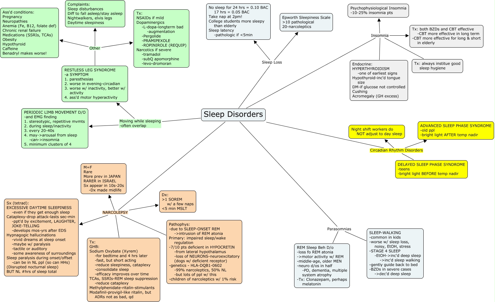 This Concept Map, created with IHMC CmapTools, has information related to: Sleep Disorders, Sleep Disorders Insomnia Tx: both BZDs and CBT effective -CBT more effective in long term -CBT more effective for long & short in elderly, Sleep Disorders Circadian Rhythm Disorders DELAYED SLEEP PHASE SYNDROME -teens -bright light BEFORE temp nadir, Sleep Disorders Sleep Loss Epworth Sleepiness Scale ᡂ pathological 20-narcoleptics, Sleep Disorders NARCOLEPSY Pathophys: -due to SLEEP-ONSET REM ->intrusion of REM atonia Primary: impaired sleep/wake regulation -7/10 pts deficient in HYPOCRETIN -from lateral hypothalamus -loss of NEURONS-neuroexcitatory (dogs w/ deficient receptor) -genetics - HLA-DQB1-0602 -99% narcoleptics, 50% NL -but lots of ppl w/ this -children of narcoleptics w/ 1% risk, RESTLESS LEG SYNDROME -a SYMPTOM 1. paresthesias 2. worse in evening-circadian 3. worse w/ inactivity, better w/ activity 4. ass'd motor hyperactivity Other Ass'd conditions: Pregnancy Neuropathies Anemia (Fe, B12, folate def) Chronic renal failure Medications (SSRIs, TCAs) Obesity Hypothyroid Caffeine Benadryl makes worse!, Sleep Disorders Moving while sleeping -often overlap RESTLESS LEG SYNDROME -a SYMPTOM 1. paresthesias 2. worse in evening-circadian 3. worse w/ inactivity, better w/ activity 4. ass'd motor hyperactivity, Sleep Disorders Circadian Rhythm Disorders Night shift workers do NOT adjust to day sleep, Sleep Disorders NARCOLEPSY Dx: ɭ SOREM w/ a few naps ɝ min MSLT, Sleep Disorders NARCOLEPSY M=F Rare More prev in JAPAN RARER in ISRAEL Sx appear in 10s-20s -Dx made midlife, Sleep Disorders Insomnia Psychophysiological Insomnia -10-25% insomnia pts, Sleep Disorders Moving while sleeping -often overlap PERIODIC LIMB MOVEMENT D/O -and EMG finding 1. stereotypic, repetitive mvmts 2. during sleep/inactivity 3. every 20-40s 4. may->arousal from sleep -can->insomnia 5. minimum clusters of 4, Sleep Disorders NARCOLEPSY Tx: GHB: Sodium Oxybate (Xyrem) -for bedtime and 4 hrs later -fast, but short acting -reduce sleepiness, cataplexy -consolidate sleep -efficacy improves over time TCAs, SSRIs-REM sleep suppression -reduce cataplexy Methylphenidate-ritalin-stimulants Modafinil-provigil-like ritalin, but ADRs not as bad, qd, RESTLESS LEG SYNDROME -a SYMPTOM 1. paresthesias 2. worse in evening-circadian 3. worse w/ inactivity, better w/ activity 4. ass'd motor hyperactivity Other Tx: NSAIDs if mild Dopaminergics -L-dopa-longterm bad -augmentation -Pergolide -PRAMIPEXOLE -ROPINIROLE (REQUIP) Narcotics if severe -tramadol -subQ apomorphine -levo-dromoran, Sleep Disorders Parasomnias REM Sleep Beh D/o -loss fo REM atonia ->motor activity w/ REM -middle-age, older MEN -neuro d/os in half -PD, dementia, multiple system atrophy -Tx: Clonazepam, perhaps melatonin, RESTLESS LEG SYNDROME -a SYMPTOM 1. paresthesias 2. worse in evening-circadian 3. worse w/ inactivity, better w/ activity 4. ass'd motor hyperactivity Other Complaints: Sleep disturbances Diff to fall asleep/stay asleep Nightwalkers, elvis legs Daytime sleepiness, Sleep Disorders Parasomnias SLEEP-WALKING -common in kids -worse w/ sleep loss, noisy, EtOH, stress -STAGE 4 SLEEP -EtOH->inc'd deep sleep ->inc'd sleep walking -gently guide back to bed -BZDs in severe cases ->dec'd deep sleep, Sleep Disorders Circadian Rhythm Disorders ADVANCED SLEEP PHASE SYNDROME -old ppl -bright light AFTER temp nadir, Sleep Disorders NARCOLEPSY Sx (tetrad): EXCESSIVE DAYTIME SLEEPINESS -even if they get enough sleep Cataplexy-drop attack-lasts sec-min -ppt'd by excitement, LAUGHTER, JOKE-TELLING -develops mos-yrs after EDS Hypnagogic hallucinations -vivid dreams at sleep onset -maybe w/ paralysis -tactile or auditory -some awareness of surroundings Sleep paralysis during onset/offset -can be in NL ppl (so can HHs) (Disrupted nocturnal sleep) BUT NL #hrs of sleep total, Sleep Disorders Insomnia Endocrine: HYPERTHYROIDISM -one of earliest signs Hypothyroid-inc'd tongue size DM-if glucose not controlled Cushing Acromegaly (GH excess), Sleep Disorders Sleep Loss No sleep for 24 hrs = 0.10 BAC 17 hrs = 0.05 BAC Take nap at 2pm! College students more sleepy than elderly Sleep latency -pathologic if ɝmin