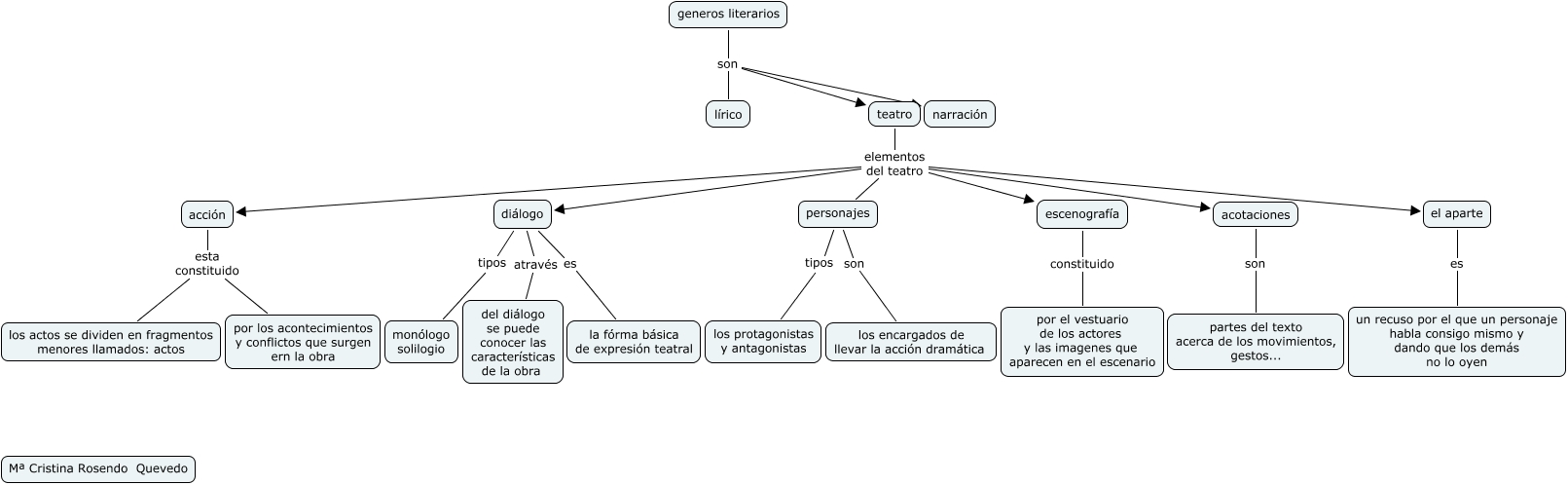 Este Cmap, tiene información relacionada con: mª cristina rosendo quevedo nº 27 2 b, teatro elementos del teatro personajes, acotaciones son partes del texto acerca de los movimientos, gestos..., teatro elementos del teatro acotaciones, generos literarios son teatro, teatro elementos del teatro diálogo, diálogo es la fórma básica de expresión teatral, personajes son los encargados de llevar la acción dramática, teatro elementos del teatro acción, teatro elementos del teatro el aparte, personajes tipos los protagonistas y antagonistas, generos literarios son lírico, escenografía constituido por el vestuario de los actores y las imagenes que aparecen en el escenario, el aparte es un recuso por el que un personaje habla consigo mismo y dando que los demás no lo oyen, acción esta constituido por los acontecimientos y conflictos que surgen ern la obra, teatro elementos del teatro escenografía, diálogo tipos monólogo solilogio, diálogo através del diálogo se puede conocer las características de la obra, acción esta constituido los actos se dividen en fragmentos menores llamados: actos, generos literarios son narración