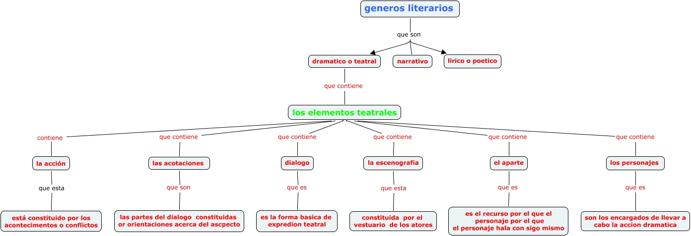 Este mapa conceptual tiene información relacionada a: diego virues suazo(eskema), los elementos teatrales que contiene las acotaciones, generos literarios que son lirico o poetico, el aparte que es es el recurso por el que el personaje por el que el personaje hala con sigo mismo, los elementos teatrales contiene la acción, generos literarios que son narrativo, la acción que esta está constituido por los acontecimentos o conflictos, los elementos teatrales que contiene dialogo, los elementos teatrales que contiene los personajes, los elementos teatrales que contiene el aparte, dialogo que es es la forma basica de expredion teatral