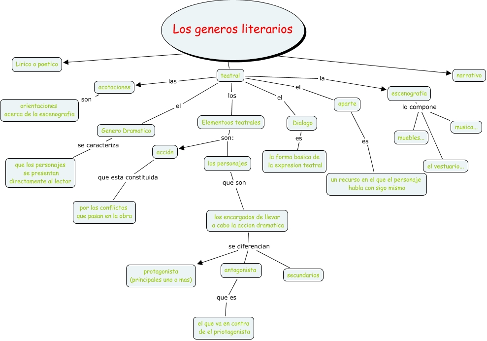 Este mapa conceptual tiene información relacionada a: 18-antonio ocaña, los encargados de llevar a cabo la accion dramatica se diferencian antagonista, teatral los Elementoos teatrales, Elementoos teatrales son: acción, los encargados de llevar a cabo la accion dramatica se diferencian secundarios, teatral el Genero Dramatico, escenografia lo compone muebles..., Genero Dramatico se caracteriza que los personajes se presentan directamente al lector, Dialogo es la forma basica de la expresion teatral, Los generos literarios estan compuestos por: narrativo, Los generos literarios estan compuestos por: Lirico o poetico