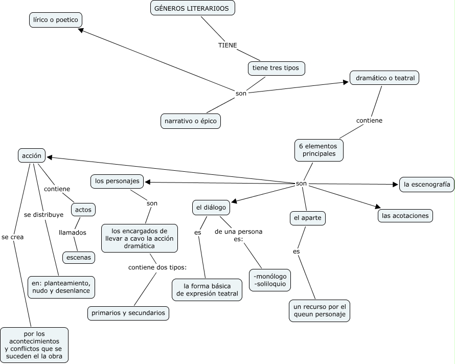 Este mapa conceptual tiene información relacionada a: Mónica Bolaños Rivera Nº3 lengua, acción se distribuye en: planteamiento, nudo y desenlance, los encargados de llevar a cavo la acción dramática contiene dos tipos: primarios y secundarios, tiene tres tipos son narrativo o épico, 6 elementos principales son acción, acción se crea por los acontecimientos y conflictos que se suceden el la obra, dramático o teatral contiene 6 elementos principales, actos llamados escenas, 6 elementos principales son las acotaciones, 6 elementos principales son la escenografía, el diálogo es la forma básica de expresión teatral