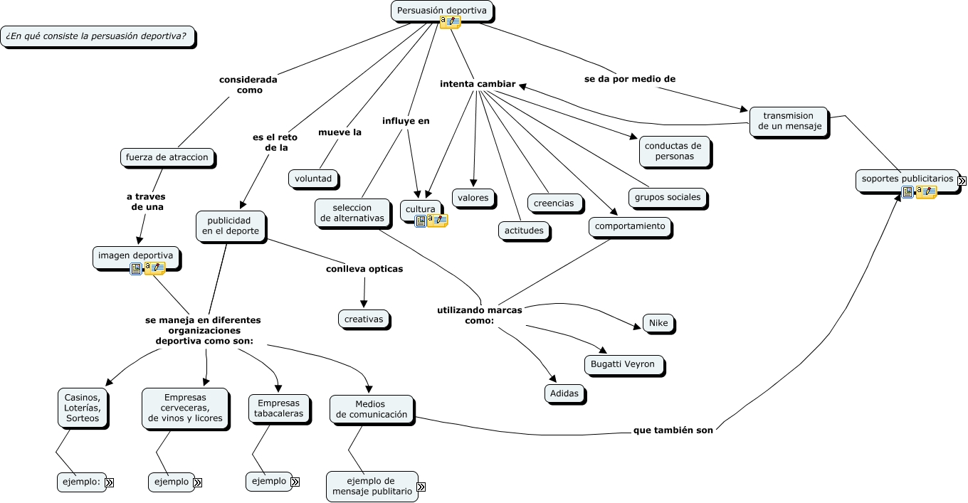 Este Cmap, tiene información relacionada con: Persuasión, transmision de un mensaje sus soportes son television, transmision de un mensaje sus soportes son cine, imagen deportiva se maneja en diferentes organizaciones deportiva como son: Medios de comunicación, comportamiento utilizando marcas como: Nike, Persuasión deportiva es el reto de la publicidad en el deporte, imagen deportiva se maneja en diferentes organizaciones deportiva como son: Casinos, Loterías, Sorteos, Medios de comunicación publicitario Centro deportivo: "Somos tu segunda casa, cuidamos tu cuerpo y nos preocupamos por tí", Empresas cerveceras, de vinos y licores ejemplos: "penalty lo que disfruras cuando disfrutas doble vwhisky", comportamiento utilizando marcas como: Bugatti Veyron, transmision de un mensaje intenta cambiar creencias, publicidad en el deporte se maneja en diferentes organizaciones deportiva como son: Empresas cerveceras, de vinos y licores, Medios de comunicación que también son soportes publicitarios, transmision de un mensaje intenta cambiar cultura, Empresas cerveceras, de vinos y licores ejemplos: "unidos por lo bueno beefeather Dry Gin", publicidad en el deporte se maneja en diferentes organizaciones deportiva como son: Medios de comunicación, Persuasión deportiva intenta cambiar creencias, Persuasión deportiva influye en cultura, publicidad en el deporte conlleva opticas creativas, transmision de un mensaje intenta cambiar valores, seleccion de alternativas utilizando marcas como: Bugatti Veyron