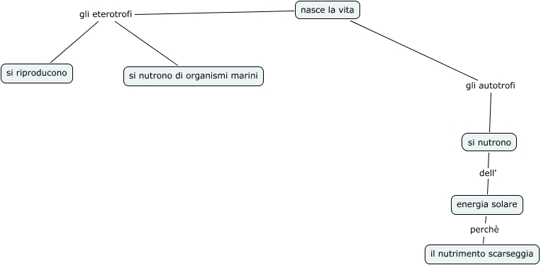 Questa Cmap, creata con IHMC CmapTools, contiene informazioni relative a: nasce la vita 4, nasce la vita gli eterotrofi si nutrono di organismi marini, energia solare perchè il nutrimento scarseggia, si nutrono dell' energia solare, nasce la vita gli eterotrofi si riproducono, nasce la vita gli autotrofi si nutrono