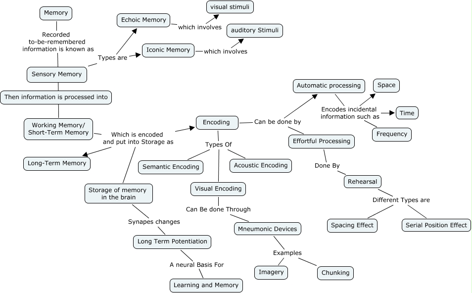 This Concept Map, created with IHMC CmapTools, has information related to: Stephanie Hester, Sensory Memory Types are Iconic Memory, Rehearsal Different Types are Serial Position Effect, Automatic processing Encodes incidental information such as Space, Encoding Can be done by Effortful Processing, Mneumonic Devices Examples Imagery, Visual Encoding Can Be done Through Mneumonic Devices, Effortful Processing Done By Rehearsal, Sensory Memory Types are Echoic Memory, Iconic Memory which involves auditory Stimuli, Working Memory/ Short-Term Memory Which is encoded and put into Storage as Encoding, Encoding Types Of Visual Encoding, Encoding Can be done by Automatic processing, Storage of memory in the brain Synapes changes Long Term Potentiation, Automatic processing Encodes incidental information such as Time, Automatic processing Encodes incidental information such as Frequency, Encoding Types Of Semantic Encoding, Mneumonic Devices Examples Chunking, Encoding Types Of Acoustic Encoding, Long Term Potentiation A neural Basis For Learning and Memory, Echoic Memory which involves visual stimuli