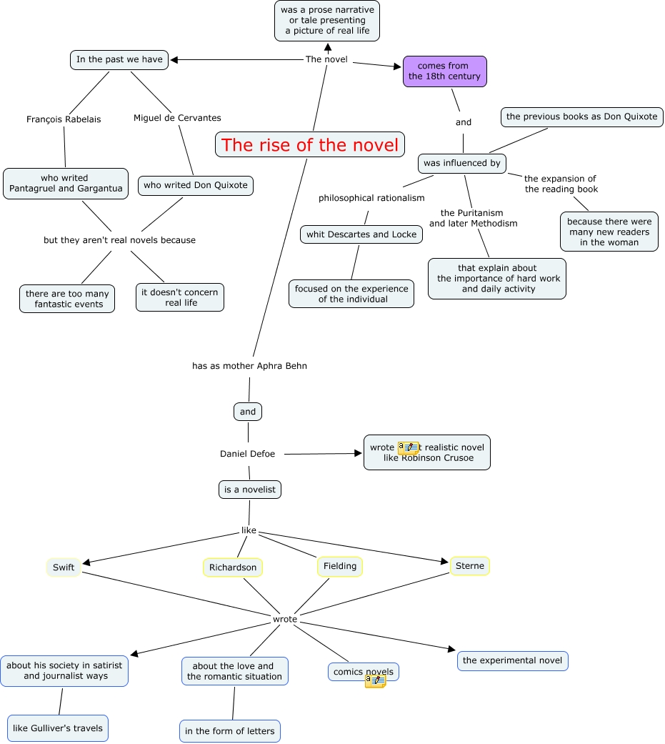 Questa Mappa Concettuale ha informazioni correlate a: The Rise of the English novel by Orciuolo, In the past we have François Rabelais who writed Pantagruel and Gargantua, who writed Pantagruel and Gargantua but they aren't real novels because it doesn't concern real life, Fielding wrote about the love and the romantic situation, was influenced by the expansion of the reading book because there were many new readers in the woman, is a novelist like Swift, is a novelist like Richardson, whit Descartes and Locke ???? focused on the experience of the individual, was influenced by philosophical rationalism whit Descartes and Locke, and Daniel Defoe is a novelist, Richardson wrote about the love and the romantic situation, comes from the 18th century and was influenced by, Swift wrote about his society in satirist and journalist ways, who writed Don Quixote but they aren't real novels because it doesn't concern real life, about his society in satirist and journalist ways like Gulliver's travels, Richardson wrote the experimental novel, is a novelist like Fielding, Fielding wrote comics novels, Richardson wrote comics novels, Richardson wrote about his society in satirist and journalist ways, about the love and the romantic situation ???? in the form of letters