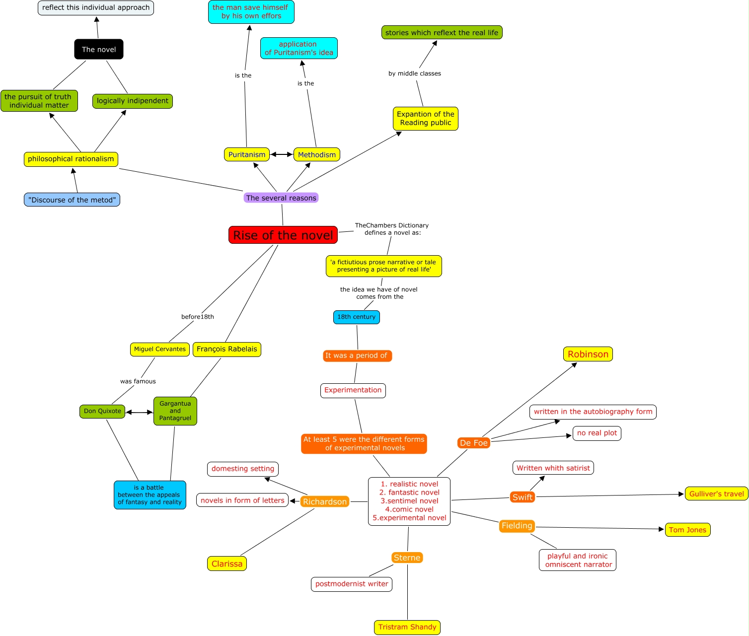 Questa Mappa Concettuale ha informazioni correlate a: Rise of novel by Baccus, 1. realistic novel 2. fantastic novel 3.sentimel novel 4.comic novel 5.experimental novel Sterne postmodernist writer, François Rabelais ???? Gargantua and Pantagruel, "Discourse of the metod" ???? philosophical rationalism, Rise of the novel The several reasons Expantion of the Reading public, philosophical rationalism The several reasons Expantion of the Reading public, Miguel Cervantes was famous Don Quixote, Methodism ???? Puritanism, Rise of the novel TheChambers Dictionary defines a novel as: 'a fictiutious prose narrative or tale presenting a picture of real life', 1. realistic novel 2. fantastic novel 3.sentimel novel 4.comic novel 5.experimental novel Richardson domesting setting, 1. realistic novel 2. fantastic novel 3.sentimel novel 4.comic novel 5.experimental novel De Foe no real plot, Gargantua and Pantagruel ???? is a battle between the appeals of fantasy and reality, Experimentation At least 5 were the different forms of experimental novels 1. realistic novel 2. fantastic novel 3.sentimel novel 4.comic novel 5.experimental novel, 18th century It was a period of Experimentation, Expantion of the Reading public by middle classes stories which reflext the real life, philosophical rationalism ???? logically indipendent, Gargantua and Pantagruel ???? Don Quixote, 1. realistic novel 2. fantastic novel 3.sentimel novel 4.comic novel 5.experimental novel Richardson Clarissa, 1. realistic novel 2. fantastic novel 3.sentimel novel 4.comic novel 5.experimental novel De Foe Robinson, 1. realistic novel 2. fantastic novel 3.sentimel novel 4.comic novel 5.experimental novel Swift Written whith satirist, 1. realistic novel 2. fantastic novel 3.sentimel novel 4.comic novel 5.experimental novel Fielding Tom Jones