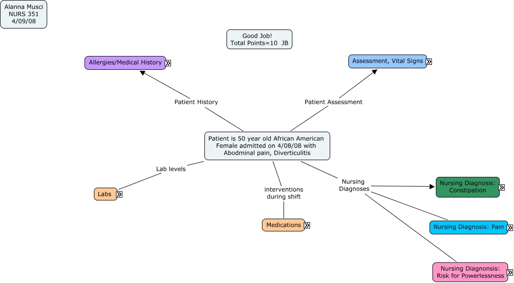 This Concept Map, created with IHMC CmapTools, has information related to: Acute Care 4.09.08, Assessment Vital Signs Vitals at 1400 Temp:37.1 C Pulse: 89 Resp: 18 B/P: 127/76 O2: 95%/ RA Pain: 7/10 Abd pain, Docusate cap 100mg PO BID use Stool softener, decreases constipation, Hydromorphone 2mg IV q4h in 50 ml NS IVPB for Pain, Keep patient NPO, only ice chips to let bowels rest and decrease pain. interventions Administer Dilaudid 2mg IV in 50ml NS PRN q4h, Encourage patient to increase mobility as tolerated to increase peristalsis outcome Patient only got out of bed to use BR., Administer Dilaudid 2mg IV in 50ml NS PRN q4h outcome Administered medication at 1620 Patient tolerated med well., Patient is 50 year old African American Female admitted on 4/08/08 with Abodminal pain, Diverticulitis Nursing Diagnoses Nursing Diagnosis: Constipation, Patient is 50 year old African American Female admitted on 4/08/08 with Abodminal pain, Diverticulitis Patient History Allergies/Medical History, Patient will verbalize decrease in pain to acceptable level below 3/10. interventions Reassess pain level 30min-1h after medication administered, Reassess pain level 30min-1h after medication administered outcome Patient pain decreased to a 0/10. Patient sleeping, Assessment Skin Skin is warm, pink, no breakdown, Patient is 50 year old African American Female admitted on 4/08/08 with Abodminal pain, Diverticulitis Lab levels Labs, Patient is 50 year old African American Female admitted on 4/08/08 with Abodminal pain, Diverticulitis Nursing Diagnoses Nursing Diagnosis: Pain, Patient is 50 year old African American Female admitted on 4/08/08 with Abodminal pain, Diverticulitis interventions during shift Medications, Constipation related to altered structure, presence of inflammation as evidenced by decreased in stool and patient's report of pressure, wanting to have a BM but unable. interventions Assess patient abdomen for distention, abnormal bowel sounds, Constipation related to altered structure, presence of inflammation as evidenced by decreased in stool and patient's report of pressure, wanting to have a BM but unable. interventions Administer Docusate Sodium as ordered to soften stool., Assessment Neuro/muscular Alert and Oriented x3 Muscle Strength: 5 BUE, 5 BLE, Up out of bed to BR, Risk for Powerlessness related to chronic nature of diseease process and recurrent episodes. Interventions Encourage client to be active in own health care management and take responsibility for diet, actions, and preventitive measures., Constipation related to altered structure, presence of inflammation as evidenced by decreased in stool and patient's report of pressure, wanting to have a BM but unable. interventions Encourage patient to increase mobility as tolerated to increase peristalsis, Assessment Respiratory Clear lung sounds No sputum/cough No accessory muscle use symmetrical expansion