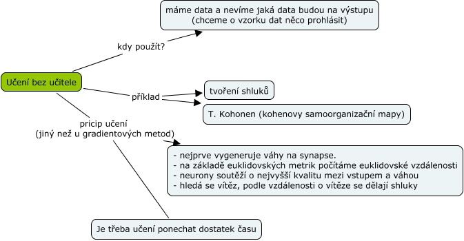 Tato Cmapa, vytvořená pomocí CmapTools, obsahuje informaci související s: Neuronove_site_uceni_bez_ucitele, Učení bez učitele kdy použít? máme data a nevíme jaká data budou na výstupu (chceme o vzorku dat něco prohlásit), Učení bez učitele pricip učení (jiný než u gradientových metod) Je třeba učení ponechat dostatek času, Učení bez učitele příklad tvoření shluků, Učení bez učitele pricip učení (jiný než u gradientových metod) - nejprve vygeneruje váhy na synapse. - na základě euklidovských metrik počítáme euklidovské vzdálenosti - neurony soutěží o nejvyšší kvalitu mezi vstupem a váhou - hledá se vítěz, podle vzdálenosti o vítěze se dělají shluky, Učení bez učitele příklad T. Kohonen (kohenovy samoorganizační mapy)