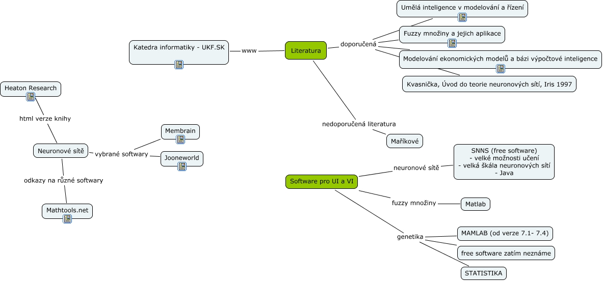 Tato Cmapa, vytvořená pomocí CmapTools, obsahuje informaci související s: Software a literatura pro umělou v výpočetní inteligenci, Software pro UI a VI neuronové sítě SNNS (free software) - velké možnosti učení - velká škála neuronových sítí - Java, Neuronové sítě odkazy na různé softwary Mathtools.net, Literatura doporučená Umělá inteligence v modelování a řízení, Literatura doporučená Kvasnička, Úvod do teorie neuronových sítí, Iris 1997, Literatura doporučená Fuzzy množiny a jejich aplikace, Software pro UI a VI genetika free software zatím neznáme, Software pro UI a VI genetika STATISTIKA, Software pro UI a VI genetika MAMLAB (od verze 7.1- 7.4), Neuronové sítě html verze knihy Heaton Research, Neuronové sítě vybrané softwary Membrain, Literatura www Katedra informatiky - UKF.SK, Literatura doporučená Modelování ekonomických modelů a bázi výpočtové inteligence, Software pro UI a VI fuzzy množiny Matlab, Literatura nedoporučená literatura Maříkové, Neuronové sítě vybrané softwary Jooneworld