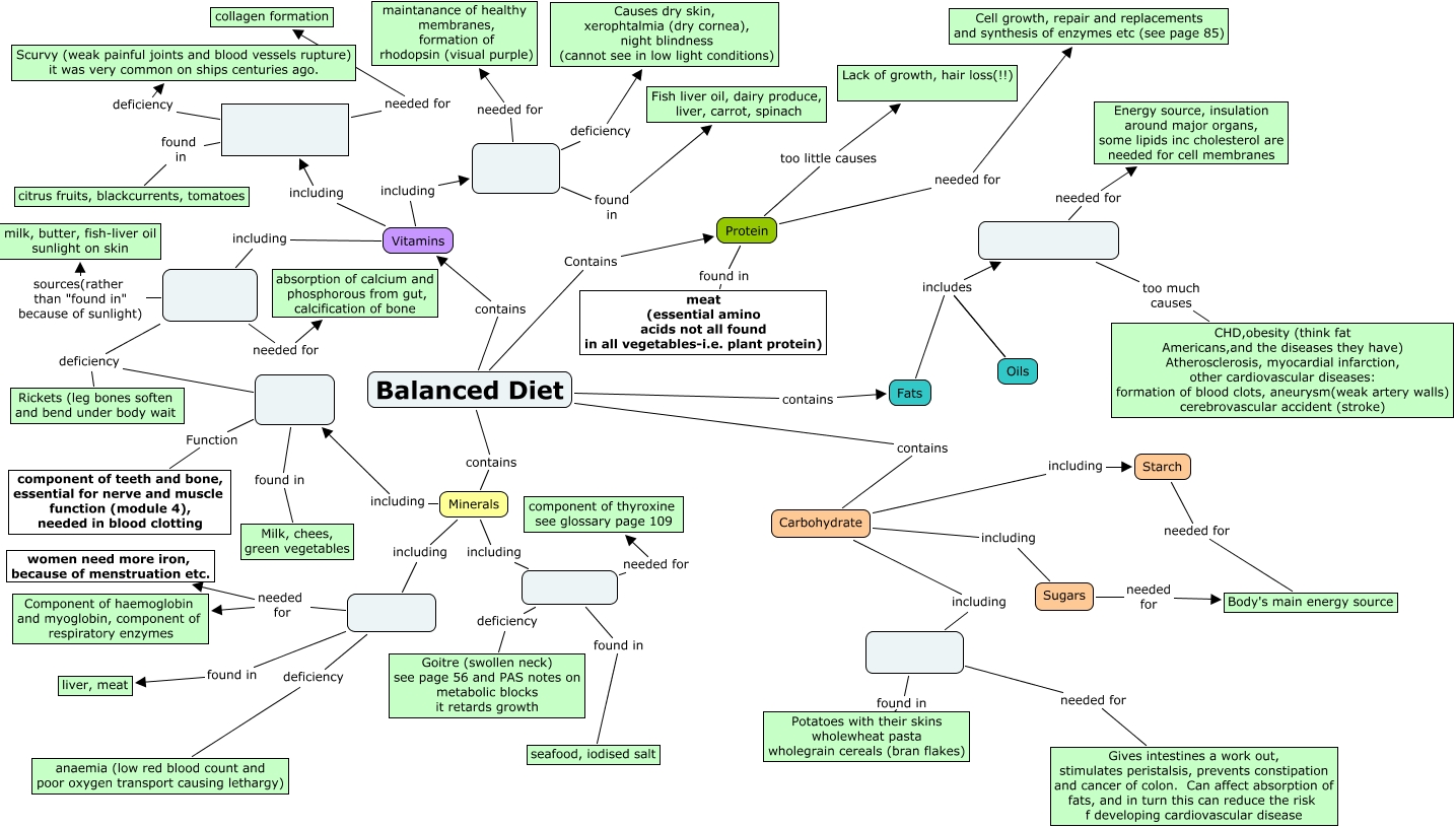 Balanced diet Gaps, Function component of teeth and bone, essential for nerve and muscle function (module 4), needed in blood clotting, Sugars needed for Body's main energy source, too much causes CHD,obesity (think fat Americans,and the diseases they have) Atherosclerosis, myocardial infarction, other cardiovascular diseases: formation of blood clots, aneurysm(weak artery walls) cerebrovascular accident (stroke), found in seafood, iodised salt, Balanced Diet contains Vitamins, Balanced Diet contains Carbohydrate, needed for Gives intestines a work out, stimulates peristalsis, prevents constipation and cancer of colon. Can affect absorption of fats, and in turn this can reduce the risk f developing cardiovascular disease, Minerals including , Starch needed for Body's main energy source, Minerals including