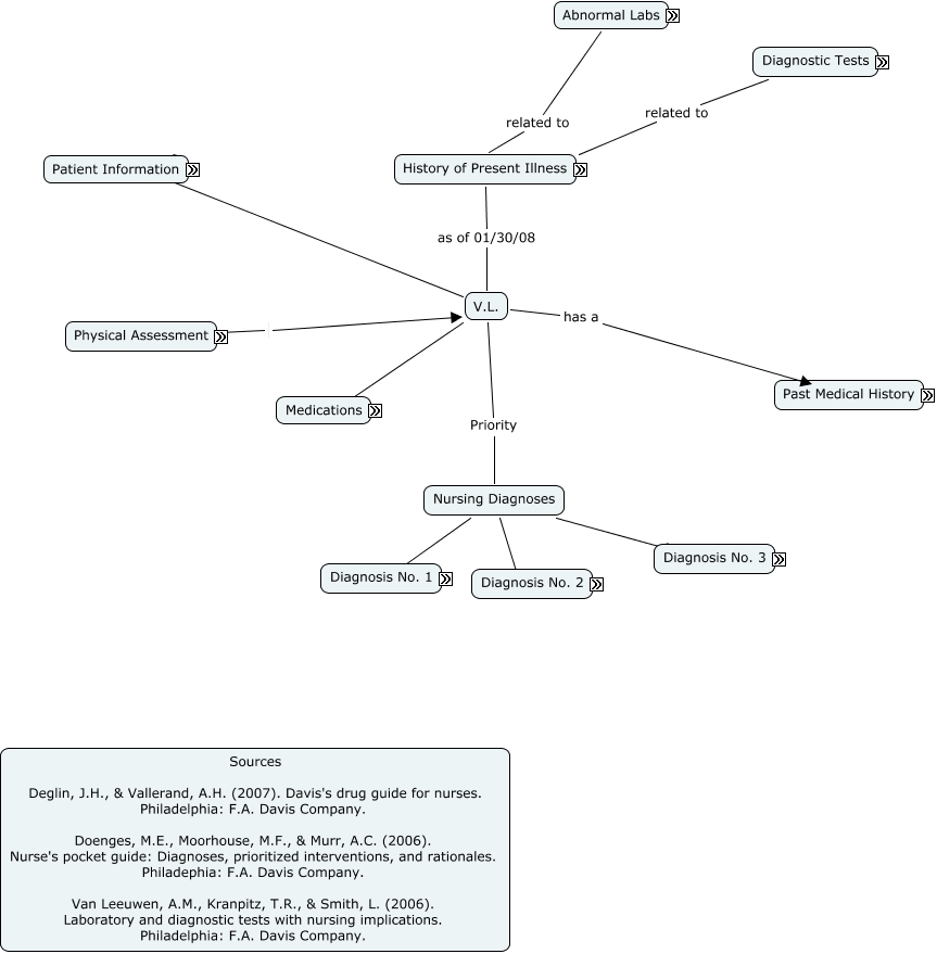 This Concept Map, created with IHMC CmapTools, has information related to: rataycmap1, Home ???? Coreg, Home ???? Norvasc, Pravachol 80mg PO daily why history of CAD & HTN, Bentyl 20mg q6h PO PRN why mgmt of irritable bowel syndrome (diarrhea), Medications ???? Hospital, Home ???? Benicar HCT, Skin intact with no signs of skin breakdown. Rectum reddened related to diarrhea and possibly colonscopy. Braden score: 19. Skin warm and pink, mucous membranes moist. Integumentary Physical Assessment, Phenergan 12.5mg/0.5mL q6h IV PRN can cause confusin, disorientation, sedation, Home ???? Zocor, history of hypertension why Norvasc 10mg PO daily, Restoril 7.5mg PO daily PRN why short-term mgmt of insomnia, Norvasc 10mg PO daily why history of hypertension, Lungs clear to auscultation bilaterally. Pulse ox stable. No signs of accessory muscle use for breathing. No sputum or cough. Respiratory Physical Assessment, V.L. Priority Nursing Diagnoses, Pt. is very pleasant and is participating in care. Family lives out of state but pt states that she has a strong support system through her friendswho she talked to on the phone for about an hour during this shift. No support persons currently present at bedside. Psychosocial Physical Assessment, PRN meds ???? Bentyl, Zocor 40mg PO daily can cause abdominal cramps, constipation, diarrhea, flatus, heartburn, rashes, V.L. ???? Patient Information, Last Bowel Movement 01/30/08. Abdomen soft, non-tender, non-distended. Pt does not report any pain with palpation. Bowel sounds hyperactive x4 quadrants. Pt still nauseated and has yellow liquid stool after meals. Pt is able to void clear yellow urine independently. Gastrointestinal Genitourinary Physical Assessment, Pt. is able to bathe, brush teeth, and eat independently. She needs assist x1 when ambulating to the bathroom and transferring to chair related to generalized muscle weakness and she does not have a cane in the hospital. Functional Physical Assessment