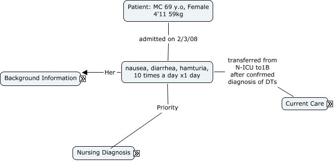 This Concept Map, created with IHMC CmapTools, has information related to: Patient 2.11, Patient: MC 69 y.o, Female 4'11 59kg admitted on 2/3/08 nausea, diarrhea, hamturia, 10 times a day x1 day, nausea, diarrhea, hamturia, 10 times a day x1 day Her Background Information, nausea, diarrhea, hamturia, 10 times a day x1 day transferred from N-ICU to1B after confrmed diagnosis of DTs Current Care, nausea, diarrhea, hamturia, 10 times a day x1 day Priority Self care deficit: risk for skin breakdown r/t decreased activity a.e.b. fatigue, increased muscle weakness, decreaed ROM, no participation in self care Interventions: increase activity levels as tolerated, passive and active ROM qshift, create turn schedule q2h Treatments: PT/OT