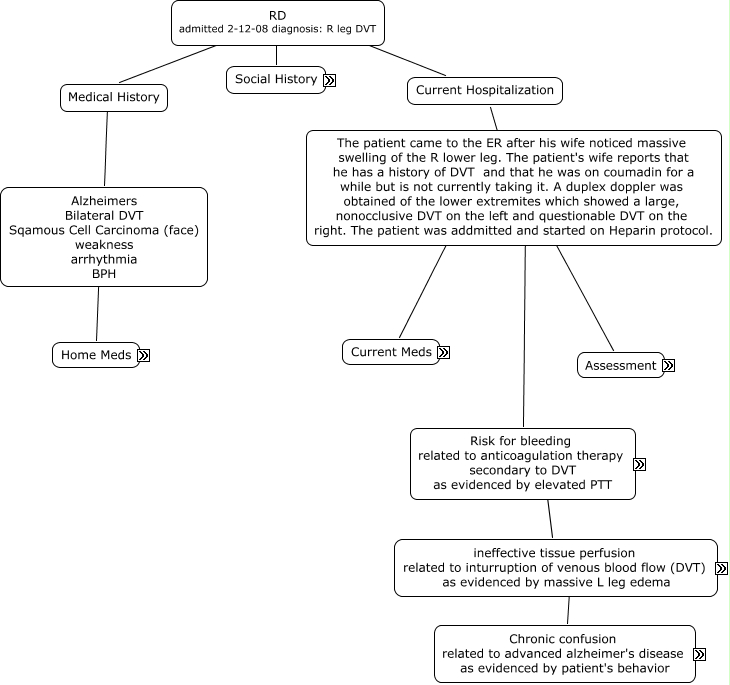 This Concept Map, created with IHMC CmapTools, has information related to: 2-13-08, The patient came to the ER after his wife noticed massive swelling of the R lower leg. The patient's wife reports that he has a history of DVT and that he was on coumadin for a while but is not currently taking it. A duplex doppler was obtained of the lower extremites which showed a large, nonocclusive DVT on the left and questionable DVT on the right. The patient was addmitted and started on Heparin protocol. ???? Risk for bleeding related to anticoagulation therapy secondary to DVT as evidenced by elevated PTT, Current Hospitalization ???? Assessment, Alzheimers Bilateral DVT Sqamous Cell Carcinoma (face) weakness arrhythmia BPH ???? Home Meds, ineffective tissue perfusion related to inturruption of venous blood flow (DVT) as evidenced by massive L leg edema ???? Chronic confusion related to advanced alzheimer's disease as evidenced by patient's behavior, Current Hospitalization ???? Current Meds, RD admitted 2-12-08 diagnosis: R leg DVT ???? Current Hospitalization, Current Hospitalization ???? The patient came to the ER after his wife noticed massive swelling of the R lower leg. The patient's wife reports that he has a history of DVT and that he was on coumadin for a while but is not currently taking it. A duplex doppler was obtained of the lower extremites which showed a large, nonocclusive DVT on the left and questionable DVT on the right. The patient was addmitted and started on Heparin protocol., RD admitted 2-12-08 diagnosis: R leg DVT ???? Social History, Medical History ???? Alzheimers Bilateral DVT Sqamous Cell Carcinoma (face) weakness arrhythmia BPH, Risk for bleeding related to anticoagulation therapy secondary to DVT as evidenced by elevated PTT ???? ineffective tissue perfusion related to inturruption of venous blood flow (DVT) as evidenced by massive L leg edema, RD admitted 2-12-08 diagnosis: R leg DVT ???? Medical History