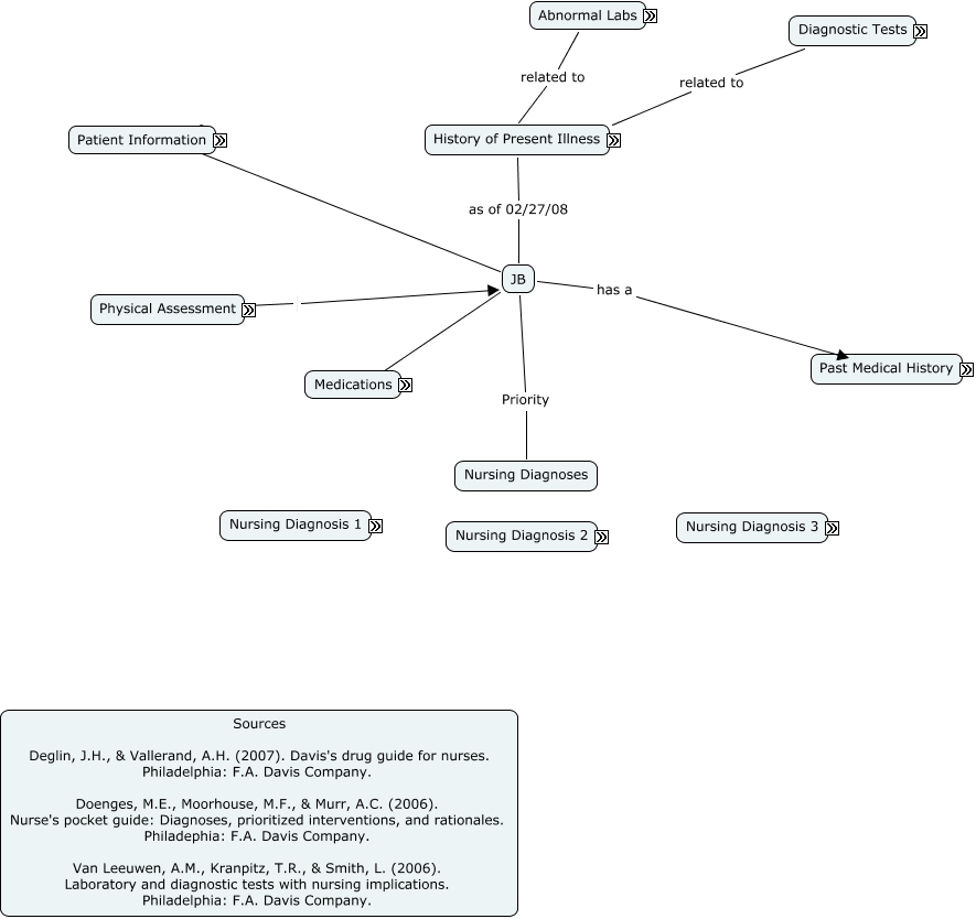 This Concept Map, created with IHMC CmapTools, has information related to: rataycmap5, JB Priority Nursing Diagnoses, JB ???? Patient Information, JB ???? Medications, Last Bowel Movement 02/22/08 Abdomen firm, non-tender, & distended. Bowel sounds present x4 quadrants. Suprapubic catheter intact and draining amber urine. He is incontinent of stool Gastrointestinal Genitourinary Physical Assessment, Medications ???? Hospital, PERRLA, pt is A&O x3. Generalized muscle atrophy, only able to move left hand. Pt is unable to sit up or walk. He is able to turn his head side to side but not shrug his shoulders. Neuromuscular Musculoskeletal Physical Assessment, JB has a Past Medical History, History of Present Illness as of 02/27/08 JB, Temp: 36.0 BP: 102/62 Resp: 22 HR: 62 SpO2: 94% Pain: 0/10 Vital Signs Physical Assessment, Physical Assessment JB, Diagnostic Tests related to History of Present Illness, Skin is dry and intact except for midline and diagonal abdominal incisions. Healed skin ulcer open to air on sacrum. Braden = 12 (sensory perception: 2; occasionally moist: 3; activity: 1; very limited mobility: 1, nutrition:3; friction and shear: 1). Skin is pale and cool, but shows signs of adequate tissue perfusion. Integumentary Physical Assessment, Lung sounds diminished bilaterally. Productive cough with white, yellow, & green sputum. Expiratory wheezes in lower lobes bilaterally, rhonci in upper lobes bilaterally. Pulse ox stable on 40% trach mask. Respiratory Physical Assessment, Medications ???? Home, Abnormal Labs related to History of Present Illness, Heart rate & rhythm regular. Peripheral pulses palpable at 2+. Capillary refill ɚ sec. S1 and S2 heart sounds auscultated. Hemodynamic vital signs stable. Cardiovascular Physical Assessment, Pt needs total care with bathing, toileting, and oral care. Pt is unable to sit in a chair or walk in the halls. Functional Physical Assessment, Pt is unable to participate in his care. No family is currently present at the bedside. Pt does not seem to be coping, appears depressed. Psychosocial Physical Assessment