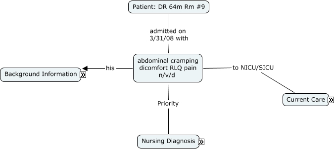 This Concept Map, created with IHMC CmapTools, has information related to: Patient 3.31, abdominal cramping dicomfort RLQ pain n/v/d his Background Information, Patient: DR 64m Rm #9 admitted on 3/31/08 with abdominal cramping dicomfort RLQ pain n/v/d, abdominal cramping dicomfort RLQ pain n/v/d to NICU/SICU Current Care, abdominal cramping dicomfort RLQ pain n/v/d Priority Nursing Diagnosis