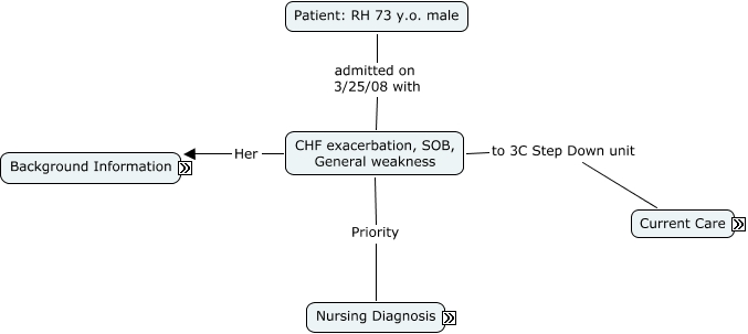 This Concept Map, created with IHMC CmapTools, has information related to: Patient 3.26, CHF exacerbation, SOB, General weakness Her Background Information, Patient: RH 73 y.o. male admitted on 3/25/08 with CHF exacerbation, SOB, General weakness, CHF exacerbation, SOB, General weakness to 3C Step Down unit Current Care, CHF exacerbation, SOB, General weakness Priority Nursing Diagnosis