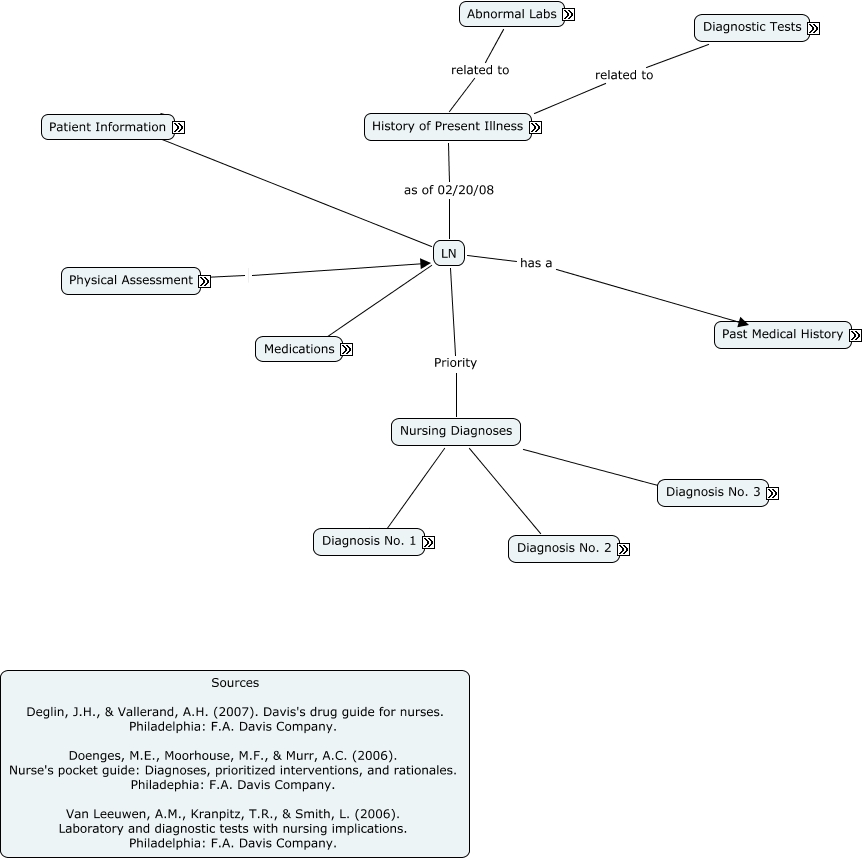 This Concept Map, created with IHMC CmapTools, has information related to: rataycmap4, Medications ???? Home, History of Present Illness as of 02/20/08 LN, Lung fields clear to auscultation bilaterally. No cough. Lung sounds diminished in lower lobes bilaterally. Pulse ox stable on room air. Respiratory Physical Assessment, Temp: 36.9 BP: 158/80 Resp: 18 HR: 81 SpO2: 94% Pain: 7/10 Vital Signs Physical Assessment, LN has a Past Medical History, Physical Assessment LN, LN Priority Nursing Diagnoses, Abnormal Labs related to History of Present Illness, Pt is very pleasant and is an active participant in her care. She is experiencing moderate to high levels of anxiety and is sometimes tearful but consolable. Her daughter is currently present at the bedside. Psychosocial Physical Assessment, Heart rate & rhythm regular. Peripheral pulses palpable at 2+. Capillary refill ɚ sec. S1 and S2 heart sounds auscultated. Hemodynamic vital signs stable, blood pressure is elevated. Cardiovascular Physical Assessment, Medications ???? Hospital, LN ???? Patient Information, Skin is dry and intact. No signs of imapired skin integrity. Braden = 19. Skin is pale and cool, but shows signs of adequate tissue perfusion. Integumentary Physical Assessment, Last Bowel Movement 02/18/08 Abdomen firm, non-tender, & distended. Pt does not report any worsened pain with palpation. Bowel sounds hyperactive x4 quadrants. Pt is able to void clear yellow urine in toilet. Reports resolving difficulty with urination. Gastrointestinal Genitourinary Physical Assessment, Pt is able to brush her teeth and hair and eat independently. She ambulates to the bathroom with assist x1. She is also able to bathe with minimal assist. Functional Physical Assessment, LN ???? Medications, Nursing Diagnoses ???? Diagnosis No. 3, Nursing Diagnoses ???? Diagnosis No. 2, Nursing Diagnoses ???? Diagnosis No. 1, PERRLA, pt is A&O x3. Generalized muscle weakness, moves all extremities. Pt states that feet are numb. Cranial nerves are intact. Gait is unstable, possibly related to abdominal & back pain. Neuromuscular Musculoskeletal Physical Assessment